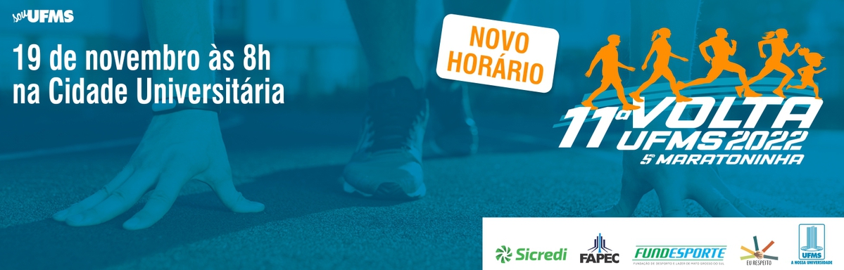 Com o objetivo de estimular a comunidade universitária e a comunidade externa a melhorarem a qualidade de vida por meio da prática de esportes, seja a corrida ou caminhada, a 11ª edição da Volta UFMS será realizada no dia 19 de novembro, às 8h, na Cidade Universitária. A 3ª Caminhada nos Câmpus será realizada no mesmo dia, às 16h.