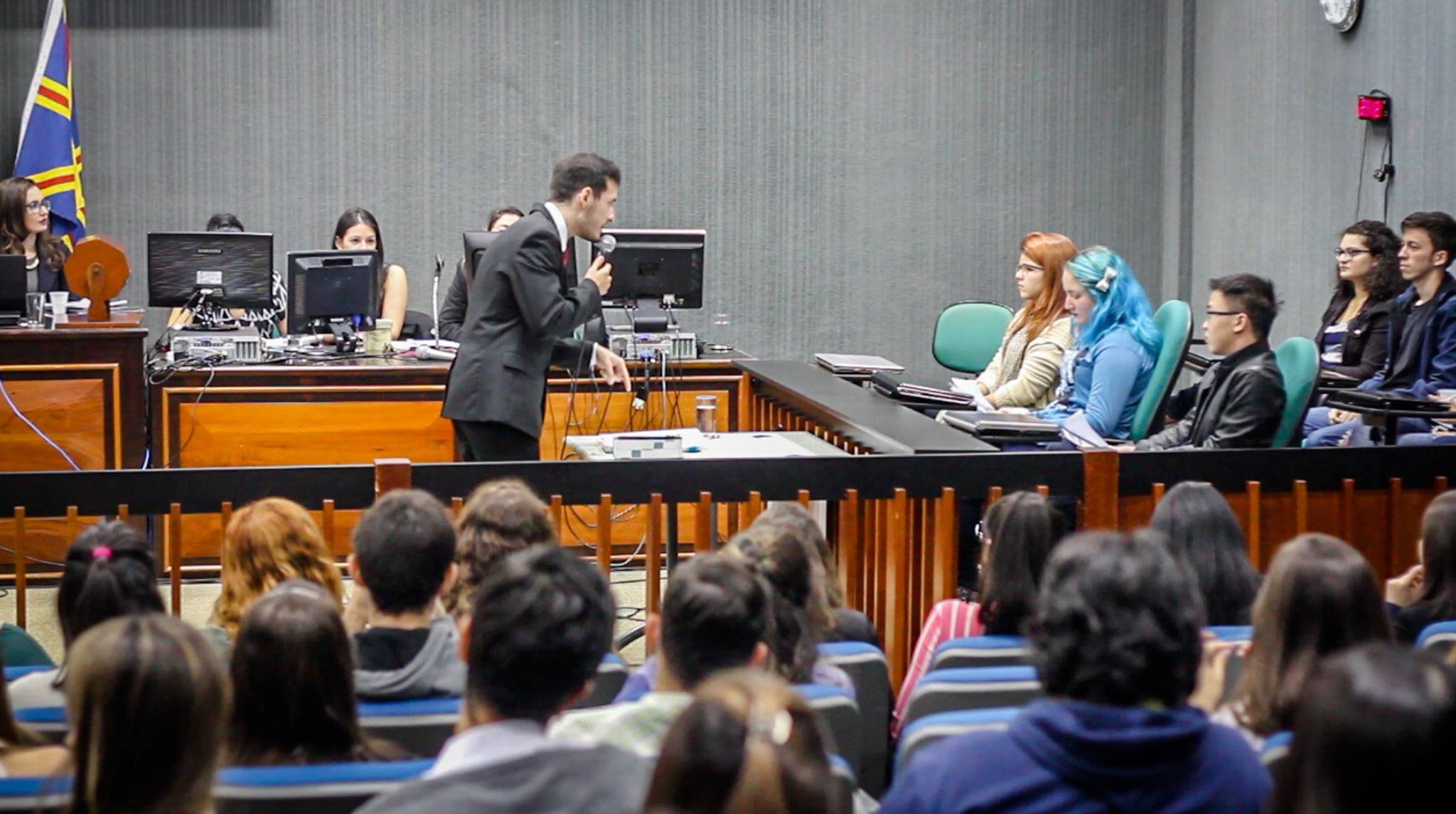 Calouros do curso de Direito da Universidade Federal de Mato Grosso do Sul tiveram uma recepção um pouco diferente neste ano. Na última sexta-feira, foi realizada uma sessão simulada do Tribunal do Júri para receber os alunos. Os acadêmicos do 9º semestre ocuparam o plenário do Tribunal de Justiça de Campo Grande e simularam um julgamento como boas-vindas, integrando os alunos.