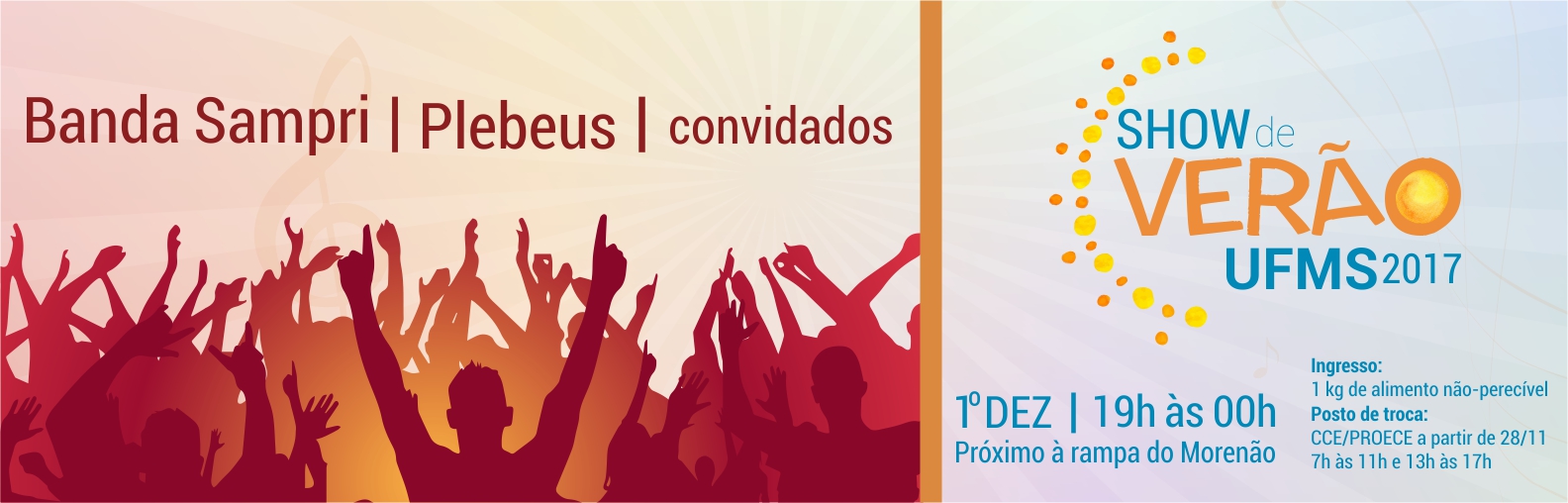 A Pró-Reitoria de Extensão, Cultura e Esporte (Proece), por intermédio da Coordenadoria de Cultura e Esporte, com o objetivo de fomentar a cultura artística musical e a integração entre a comunidade da Universidade Federal de Mato Grosso do Sul, envolvendo a comunidade externa, realizará no dia 1º de dezembro, das 19h às 00h, o 1º Show de Verão da UFMS.