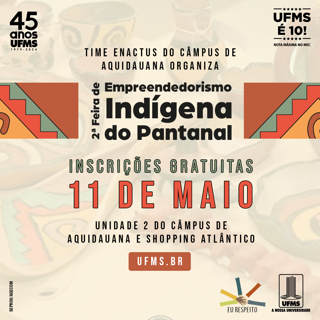Neste sábado, 11, é realizada a 2ª edição da Feira de Empreendedorismo Indígena do Pantanal, organizada pelo Time Enactus do Câmpus de Aquidauana (Cpaq) e parceiros. O evento é gratuito e aberto às comunidades interna e externa, com palestras no auditório da Unidade 2, do Cpaq, além de exposições e intervenções artísticas no Shopping Atlântico. As inscrições podem ser feitas no formulário on-line por visitantes, expositores, estudantes, apoiadores e voluntários.