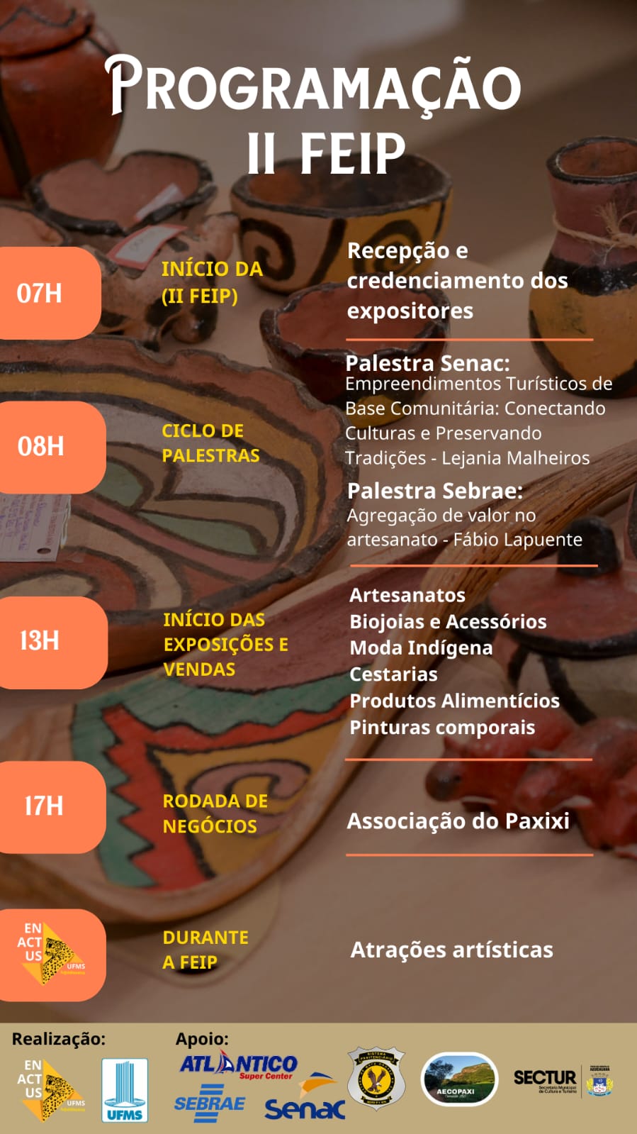Durante a programação, o público pode conferir o ciclo de palestras, com apresentações do Senac MS e do Sebrae MS, que abordam temas como o empreendedorismo turístico e a agregação de valor no artesanato. No período da tarde, é possível aproveitar o trabalho dos expositores, que levam biojoias, acessórios, moda indígena, cestarias, produtos alimentícios e pinturas corporais. A partir das 17h, a Associação do Paxixi integra a rodada de negócios e o evento encerra com atrações artísticas, incluindo apresentação da Orquestra Indígena Teko Arandu.