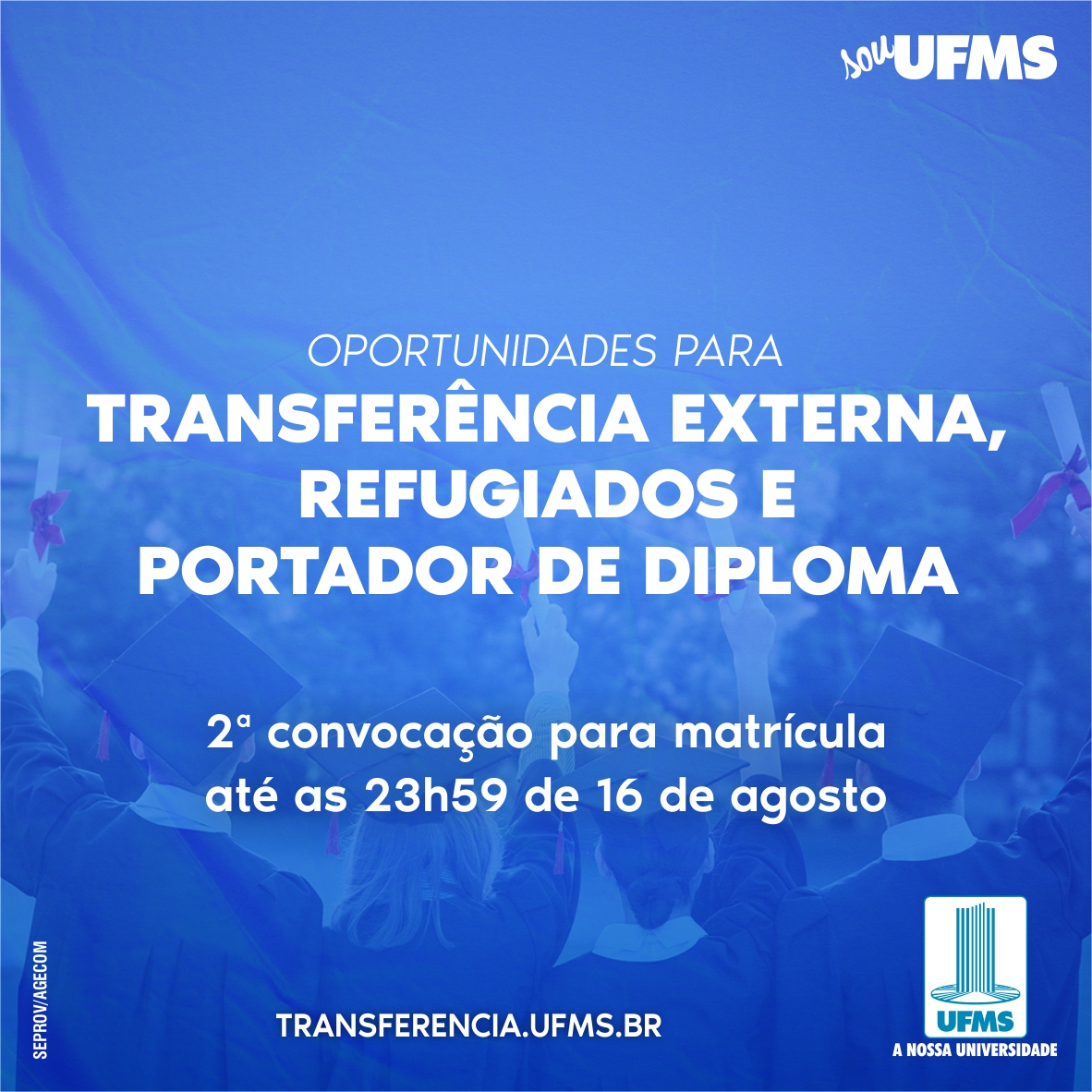 A lista com os contemplados na 2ª convocação para transferência externa, refugiados e portadores de diploma da UFMS já pode ser acessada neste link no site ingresso.ufms.br. A matrícula pode ser feita até a próxima segunda-feira, 16 de agosto.