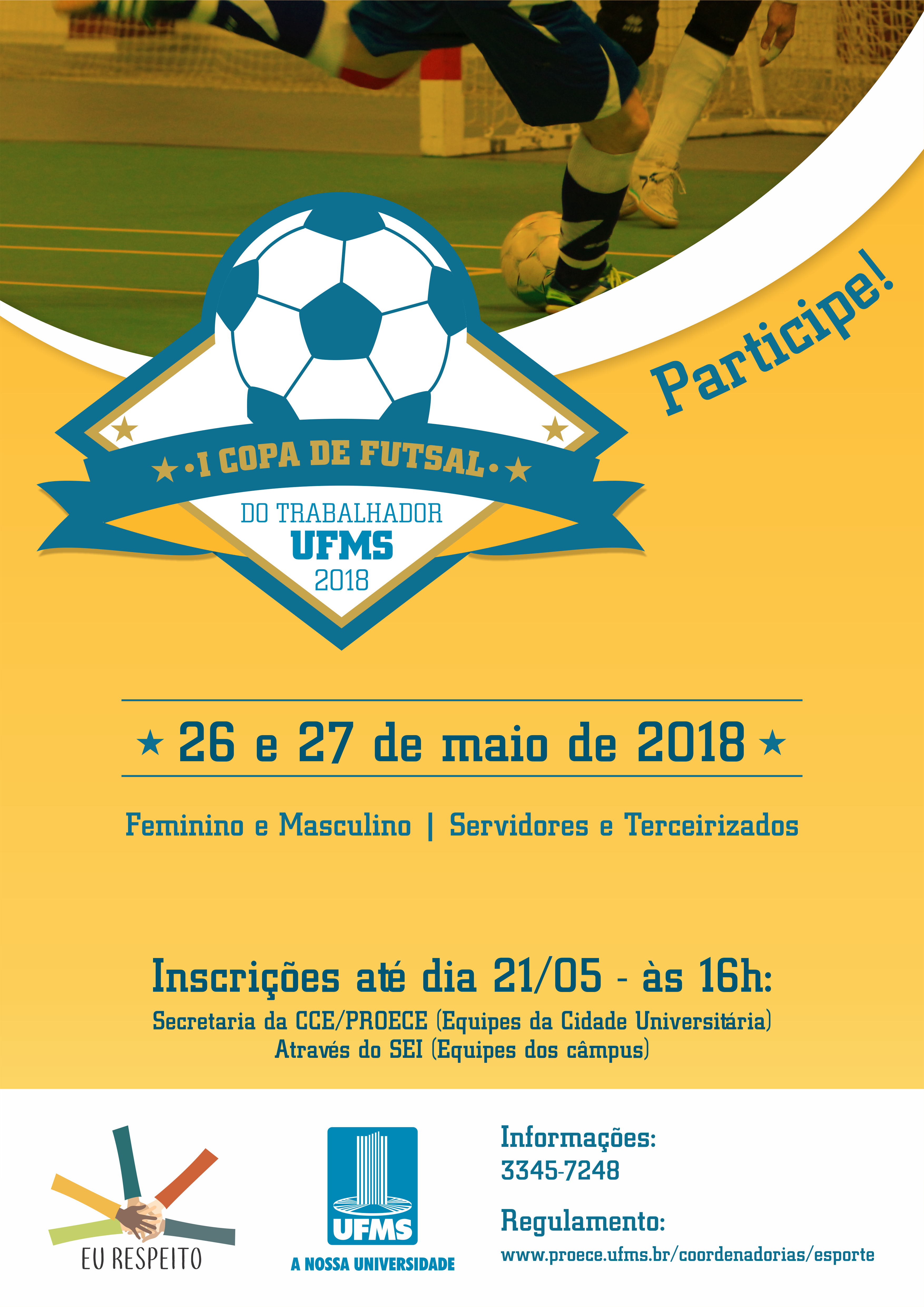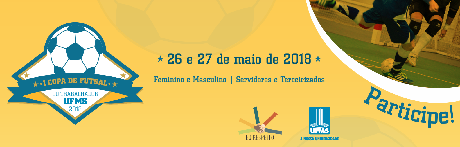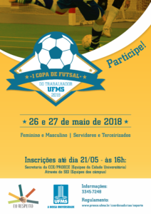 Como parte da campanha Eu Respeito do mês de maio, que celebra a Universidade, nos dias 26 e 27 será realizada a I Copa de Futsal do Trabalhador UFMS, nas modalidades feminino e masculino, e as partidas acontecerão no Ginásio Moreninho.