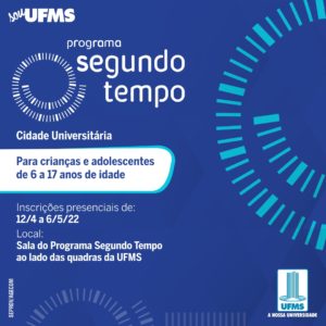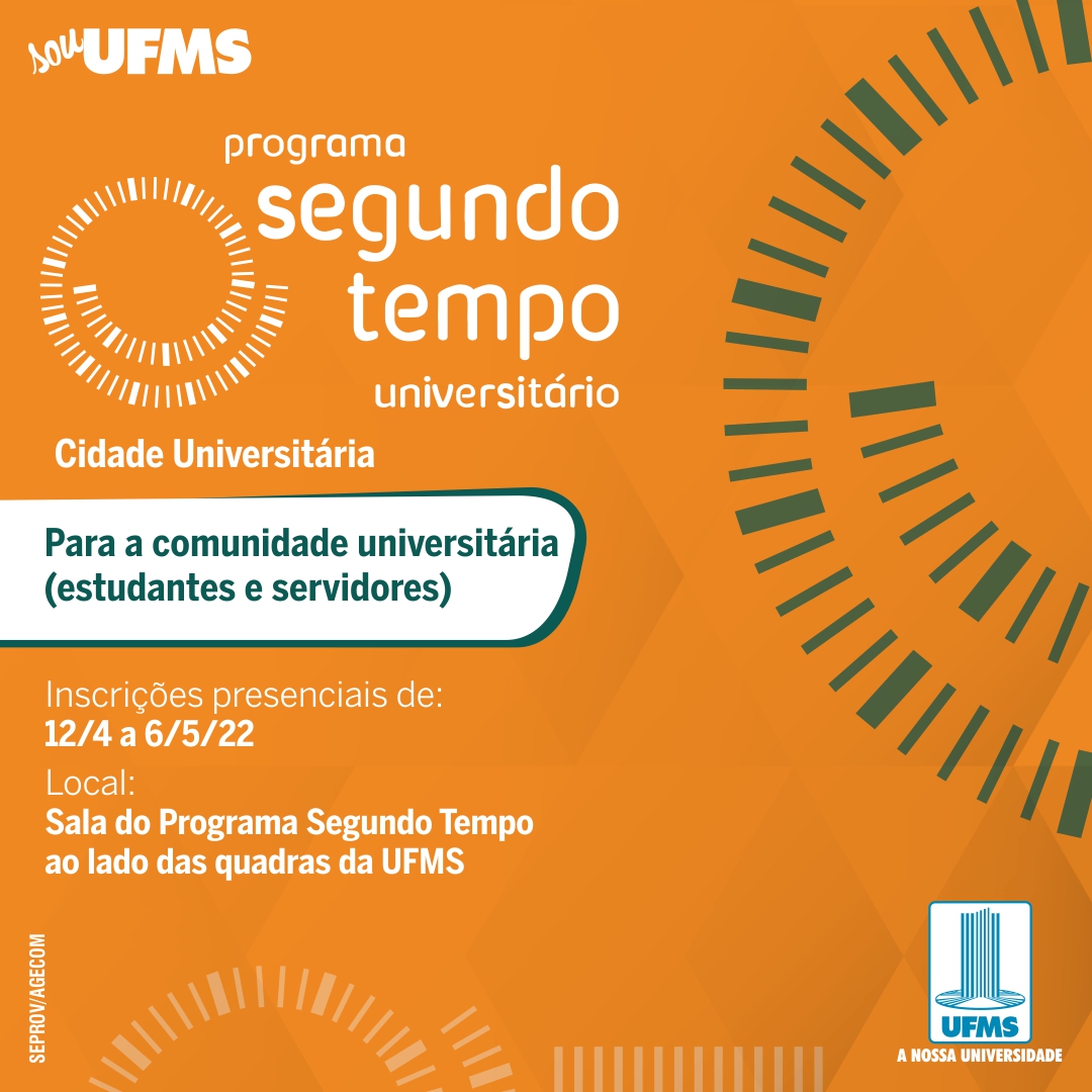 Estudantes de graduação e pós-graduação da UFMS e crianças e adolescentes de toda a comunidade têm uma nova oportunidade de participarem dos programas Segundo Tempo Universitário (PSTU) e Segundo Tempo (PST). A participação é gratuita e entre as atividades que serão realizadas tanto na Cidade Universitária em Campo Grande, quanto no Câmpus do Pantanal em Corumbá, estão: lutas, esportes de aventura, atletismo, ginástica, atividades circenses e rítmicas, voleibol, futsal, hidroginástica, natação e treinamento funcional.