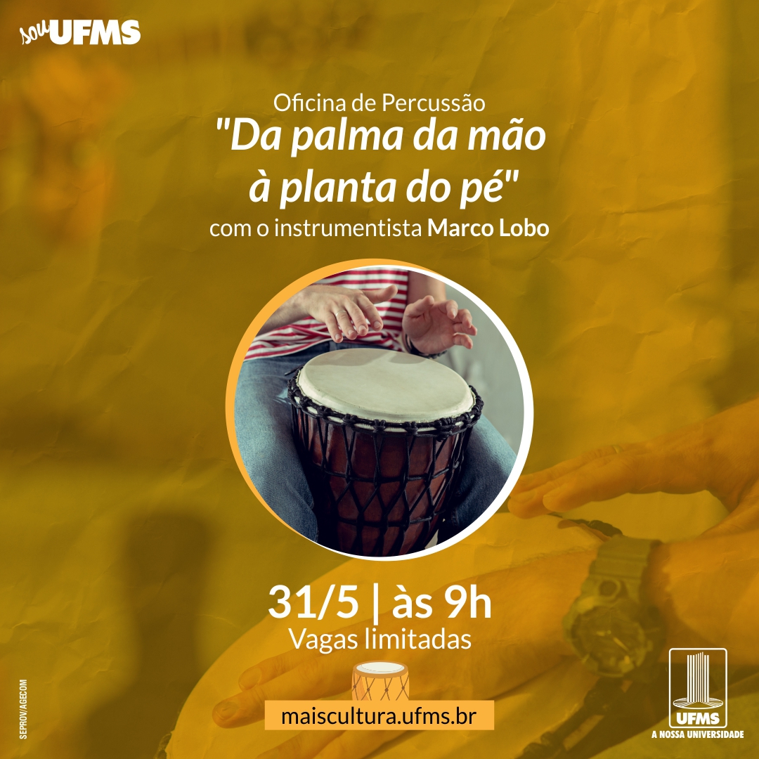 A oficina “Da palma da mão à planta do pé” será ministrada pelo compositor, pesquisador de sons e ritmos, criador de instrumentos e músico Marco Lobo, no dia 31 de maio, às 9h, no auditório do curso de Música, na Cidade Universitária. Podem participar estudantes, músicos iniciantes e profissionais da comunidade externa.