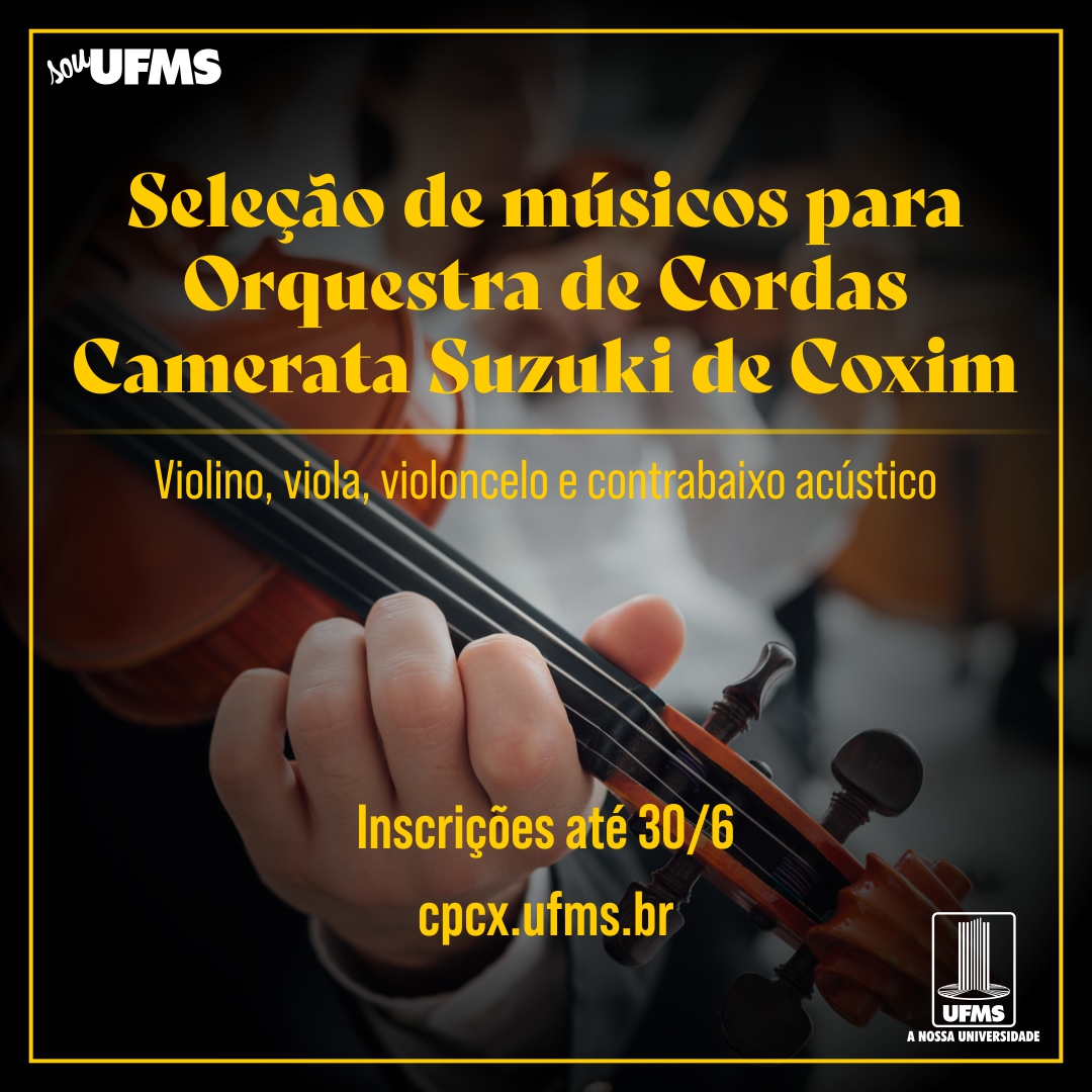Músicos interessados em integrar a orquestra de cordas Camerata Suzuki de Coxim têm até 30 de junho para se candidatarem ao núcleo principal. As oportunidades são para violino, viola, violoncelo e contrabaixo acústico. As inscrições podem ser feitas neste link.