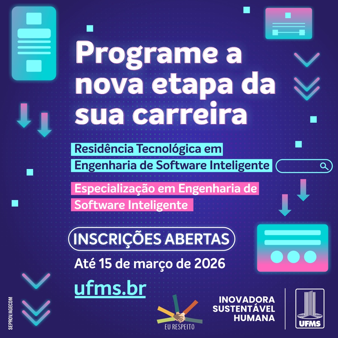 Profissionais interessados em desenvolver soluções em engenharia de software e inteligência artificial têm até 15 de março para se inscrever na residência tecnológica e especialização em Engenharia de Software Inteligente. O programa é oferecido por meio de parceria entre a UFMS, o Tribunal de Justiça de Mato Grosso do Sul (TJMS), a Escola Judicial do Estado (Ejud-MS), a Procuradoria-Geral do Estado (PGE-MS) e a Fundação de Apoio à Pesquisa, ao Ensino e à Cultura (Fapec).