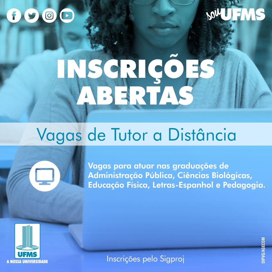 Estão abertas até 3 de janeiro de 2020 as inscrições para o Processo Seletivo de Tutor a Distância, para atuar nos cursos de graduação a distância da UFMS, organizado pela Secretaria Especial de Educação a Distância (Sead) da UFMS. O programa receberá apoio da Coordenação de Aperfeiçoamento de Pessoal de Nível Superior (Capes) e da Universidade Aberta do Brasil (UAB). As vagas são temporárias e com recebimento por meio de bolsa.