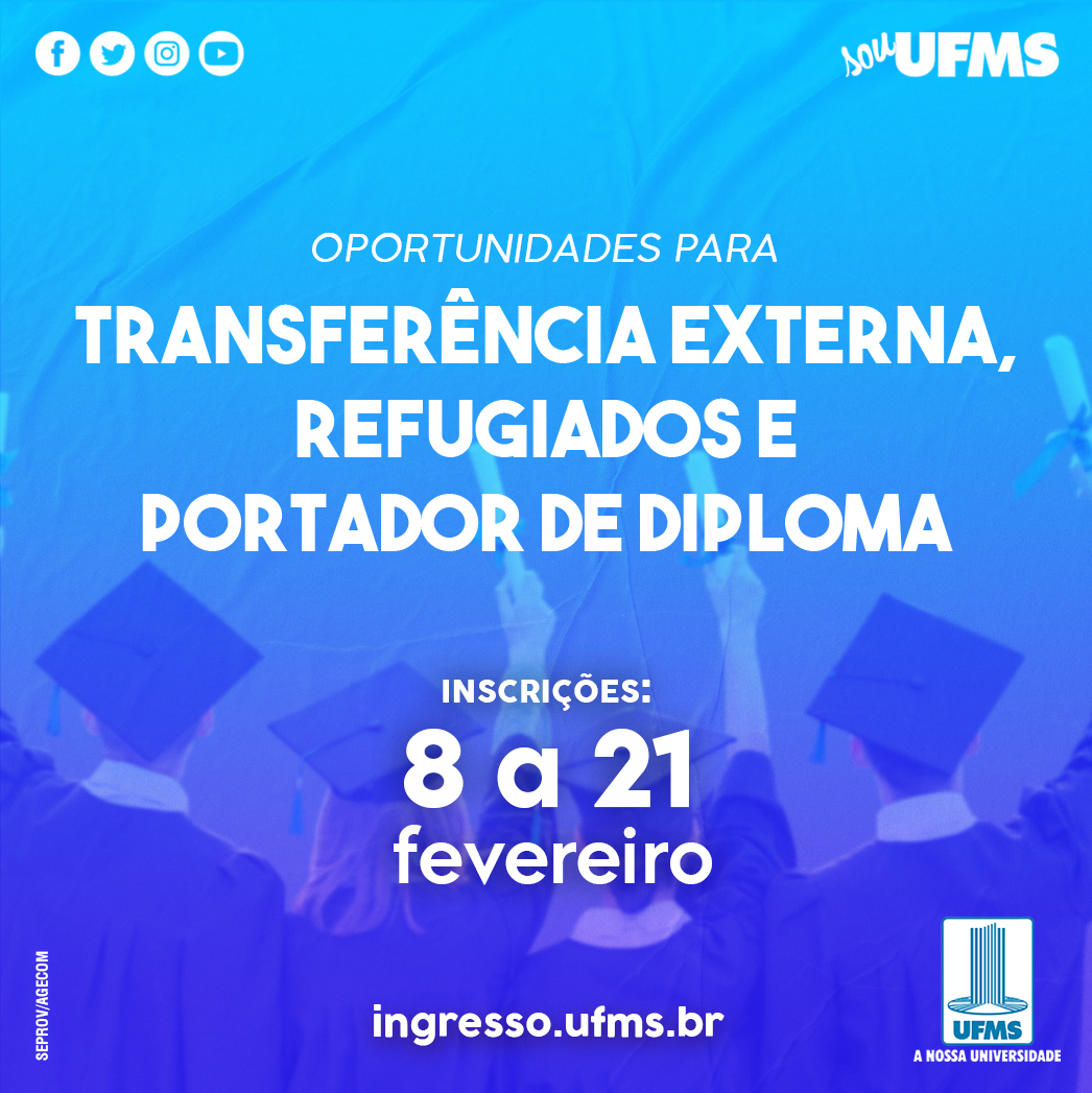 Estudantes de outras instituições, estrangeiros e graduados que queiram estudar na UFMS terão de hoje, 8, até 21 de fevereiro para inscrição. Ao todo são 1.131 vagas distribuídas em 34 cursos ofertados em 10 municípios de Mato Grosso do Sul.