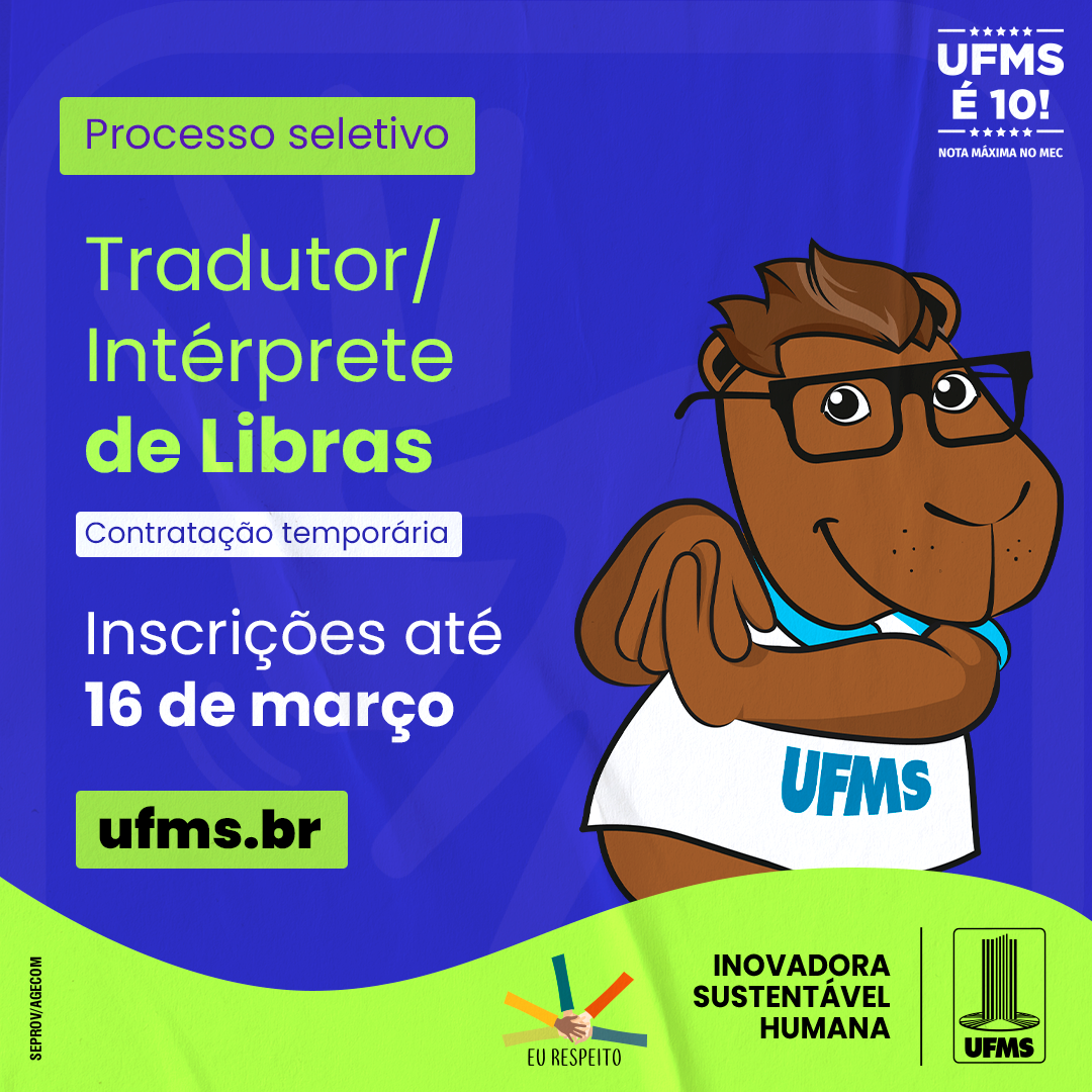 O processo seletivo para contratação temporária de tradutor/intérprete da Língua Brasileira de Sinais (Libras) recebe inscrições até domingo, 16. Os profissionais devem anexar cópias dos documentos que comprovem a formação exigida na área do candidato da página concursos.ufms.br. O processo seletivo é gratuito e busca garantir o atendimento de estudantes surdos matriculados nos cursos de graduação e pós-graduação da UFMS.