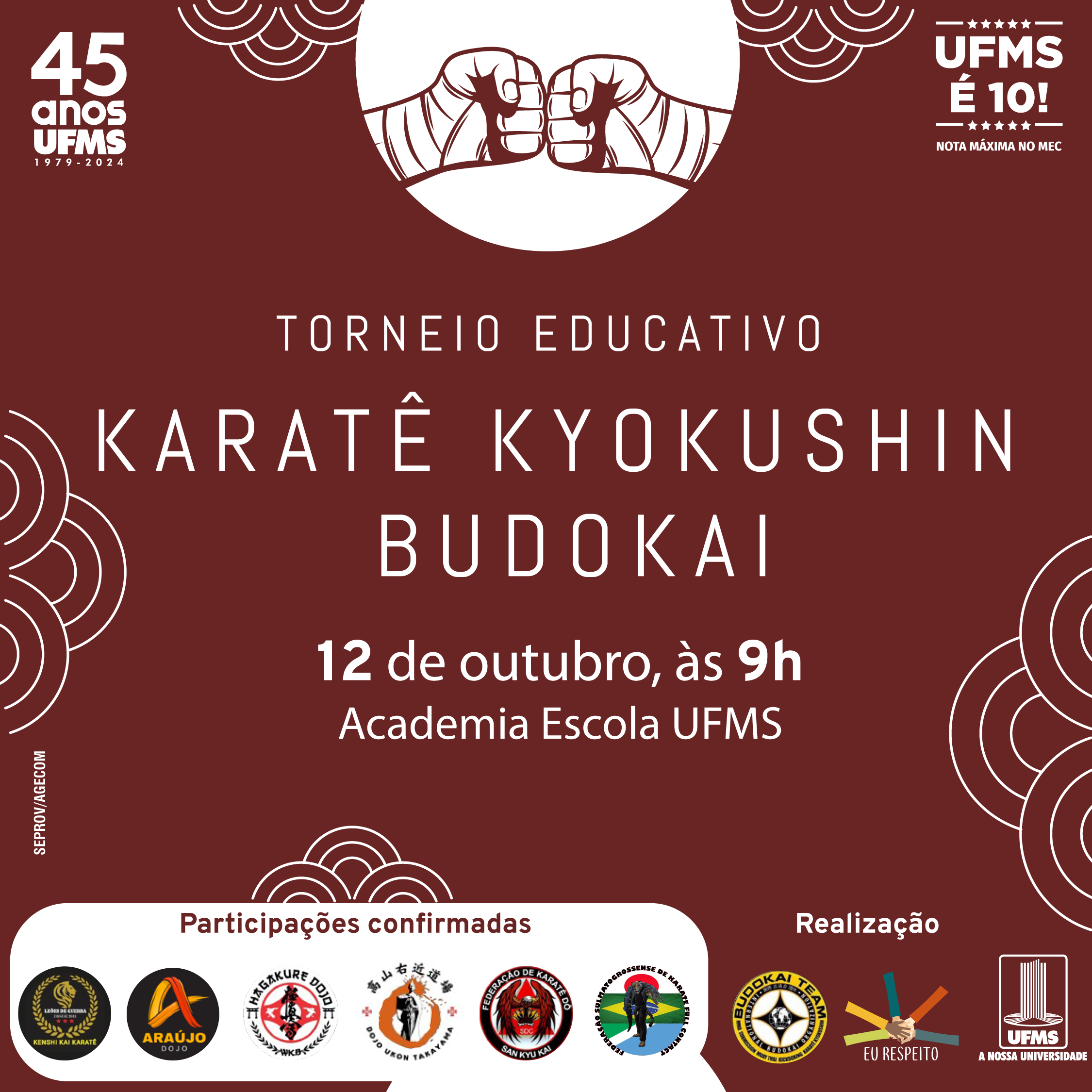 A Academia Escola da UFMS recebe neste sábado, 12, a partir das 9h, a primeira edição do torneio educativo Karatê Kyokushin Budokai, que tem como objetivo fortalecer a integração do esporte com a sociedade. O torneio faz parte de uma iniciativa entre a Universidade e a Federação de Karatê Budokai, aberto a toda comunidade.
