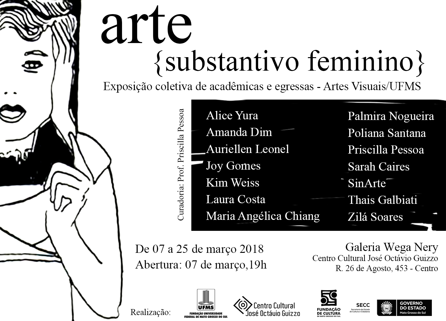 Com abertura marcada para as 19h do dia 7 de março, no Centro Cultural José Octávio Guizzo em Campo Grande, artistas que são ou foram acadêmicas dos cursos de Artes Visuais da UFMS expõem obras que tratam de questões femininas e contemporâneas. A mostra intitulada “Arte {substantivo feminino}” tem curadoria da professora Priscilla Pessoa, conta com 14 artistas, e estará aberta ao público de 7 a 25 de março de 2018, na Galeria Wega Nery.