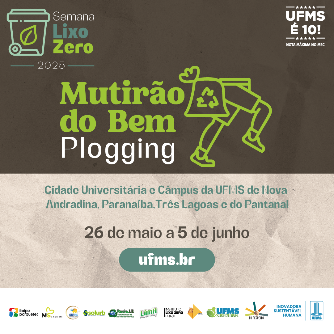 Em alusão ao Dia Mundial do Meio Ambiente, 5 de junho, está sendo promovido o Mutirão do Bem – Plogging nos Câmpus da UFMS de Paranaíba (CPar), Três Lagoas (CPTL), do Pantanal (CPan), de Nova Andradina (CPNA) e na Cidade Universitária. O objetivo é promover mais conscientização em relação à importância do descarte correto do lixo e, também, à prática de atividade física. A iniciativa das pró-reitorias de Cidadania e Sustentabilidade (Procids) e de Extensão, Cultura e Esporte (Proece) integra a campanha Eu Respeito de junho.