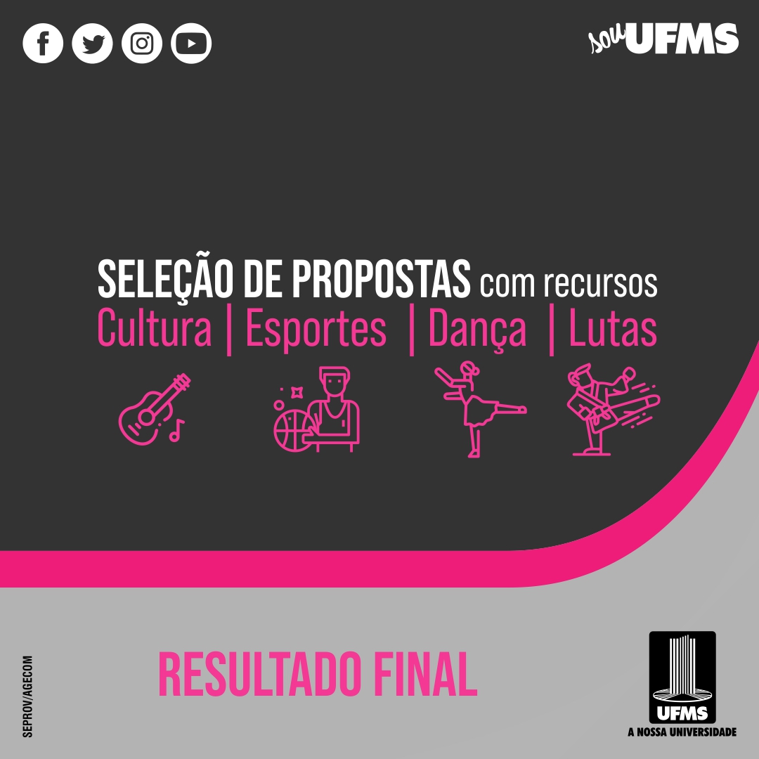 Para ações de esporte foram aprovados os projetos: “Dança em casa”; “Joga e joga – Futsal no Campus do Pantanal (Cpan)”; “Saúde e Esporte no Campus de Paranaíba (Cpar)”; “Sábado de futebol no Morenão”; “Pró-vôlei UFMS”; “Pró-vôlei de praia UFMS”; “Capoeira Angola na UFMS”; “Luta, dança e música afro-brasileira”; “Taekwondo” e “Atividade Física para a Saúde do Servidor”.