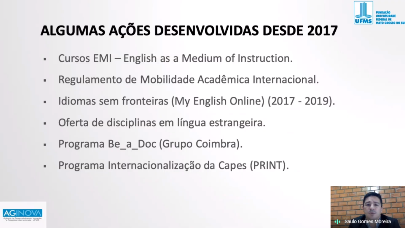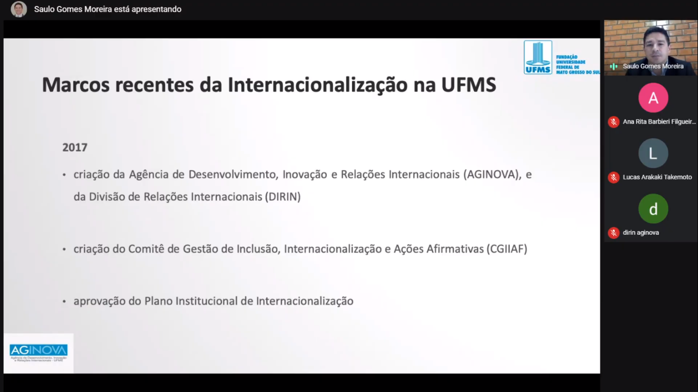 Hoje, 21, a programação vespertina do Seminário Internacional On-line iniciou com a apresentação do Programa UFMS Internacional, que busca o posicionamento internacional da instituição.