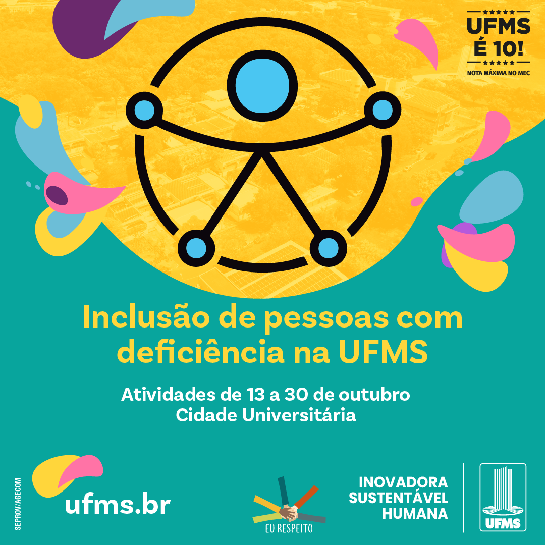 Uma série de atividades serão realizadas de 13 a 30 de outubro na Cidade Universitária, com o intuito de promover a inclusão e o respeito à pessoa com deficiência na UFMS. Gratuitas e abertas a toda a comunidade, as ações fazem parte da campanha Eu Respeito, que em outubro tem como tema A pessoa. Não há necessidade de inscrição prévia.