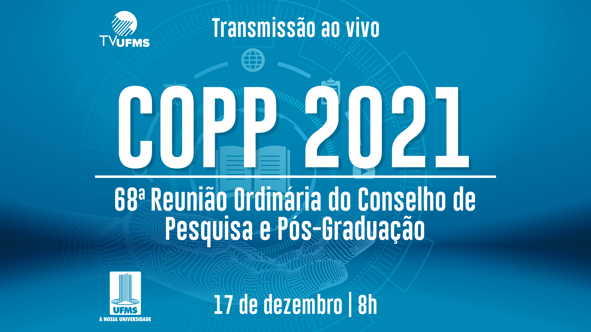 Acompanhe a 68ª Reunião Ordinária do Conselho de Pesquisa e Pós-graduação 4 anos atrás - 17/12/202117/12/2021 Notícias A TV UFMS transmite ao vivo a 68ª Reunião Ordinária do Conselho de Pesquisa e Pós-graduação, a partir das 8h. Confira: