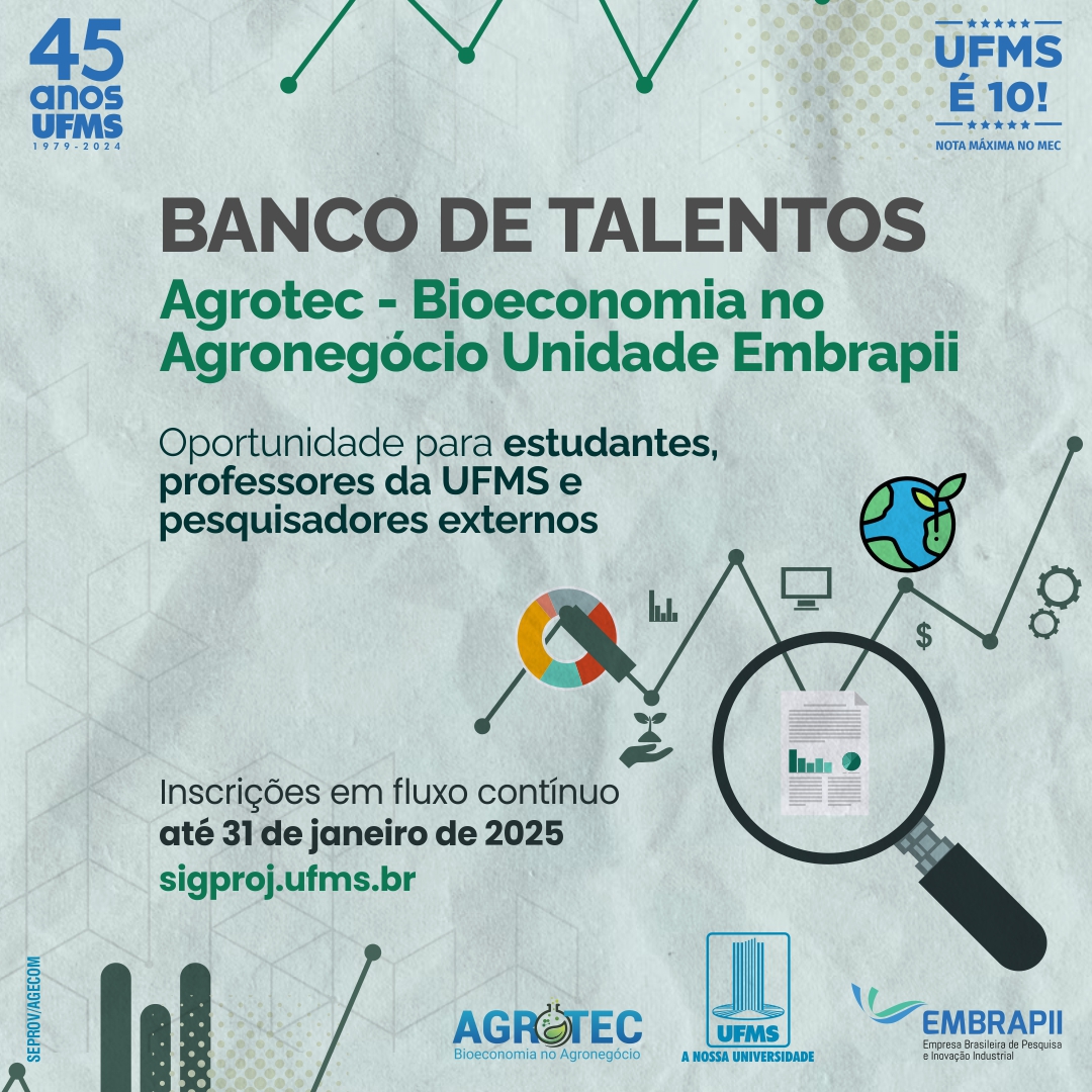 Estudantes, professores da Universidade e pesquisadores externos com interesse em desenvolver produtos inovadores nas áreas de bioeconomia, tecnologia de alimentos ou tecnologias para sustentabilidade no agronegócio podem se inscrever no Banco de Talentos da Agrotec – Bioeconomia no Agronegócio unidade Embrapii da UFMS. As inscrições são feitas em fluxo contínuo até dia 31 de janeiro de 2025, no Sistema de Informação e Gestão de Projetos.