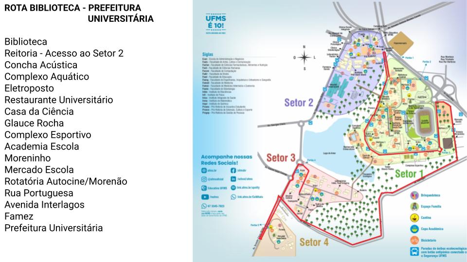A UFMS oferece ônibus para o translado de estudantes e servidores, na Cidade Universitária, interligando os quatro setores da Universidade, entre a Prefeitura Universitária, no setor 3, que inclui o Instituto de Química e a Escola de Administração e Negócios, até a Biblioteca Central, no setor 1, passando pela Faculdade de Medicina Veterinária e Zootecnia, no setor 4, e a Reitoria, no setor 2, além de percorrer toda a extensão da Avenida da Ciência.