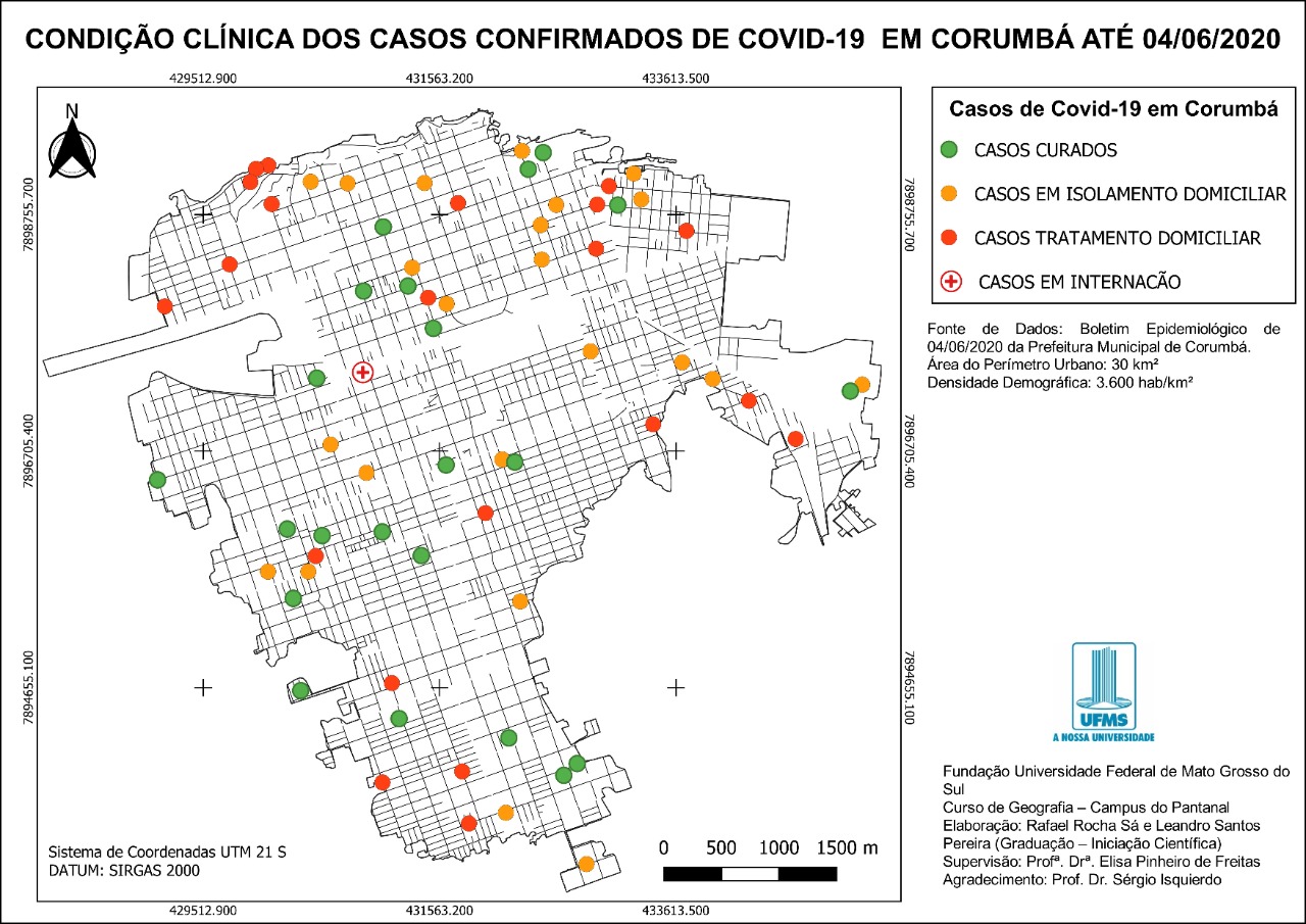 Coordenado pela professora Elisa Pinheiro de Freitas, do curso de Geografia e do Mestrado em Estudos Fronteiriços (Cpan), o projeto “Análise espacial dos casos de Covid-19 em Corumbá/Ladário” repassa diariamente, desde 30 de maio, à Prefeitura e à Secretaria Municipal de Saúde de Corumbá, o mapeamento dos casos locais.