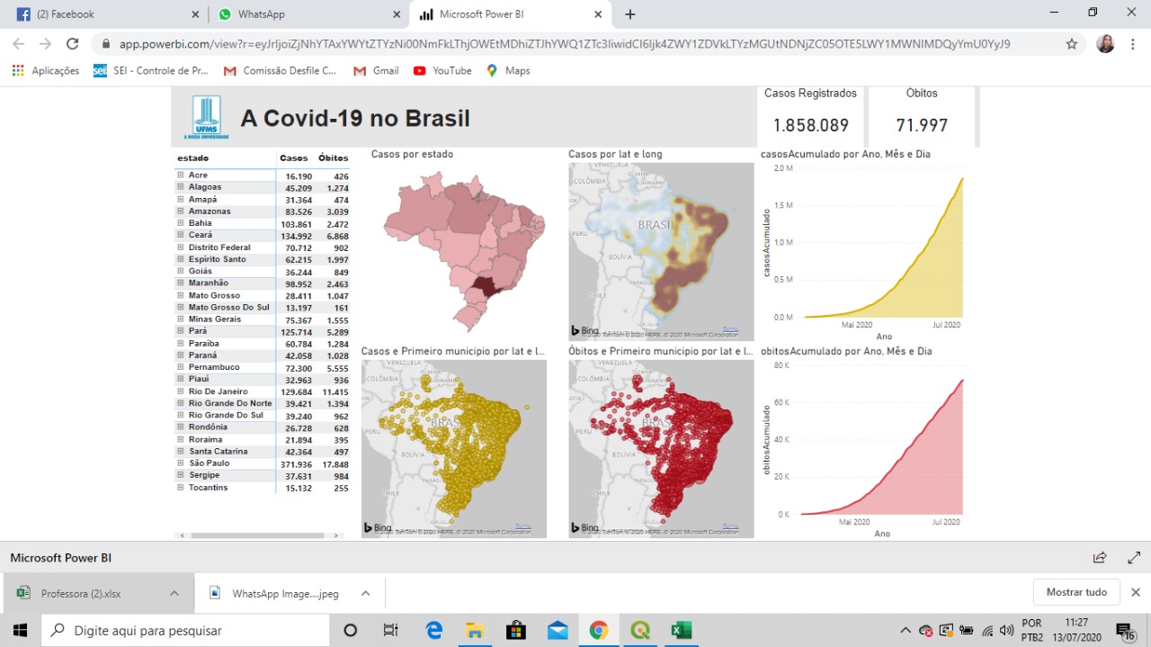 A iniciativa de organizar os dados acumulados sobre a Covid-19 no Brasil, e em específico no estado de Mato Grosso do Sul e na região de fronteira, por meio do projeto “Análise espacial dos casos de Covid-19”, ganhou nova ferramenta com a inserção de imagens, gráficos e animações como gifs na Plataforma Powerbi (https://bityli.com/tzjBp).