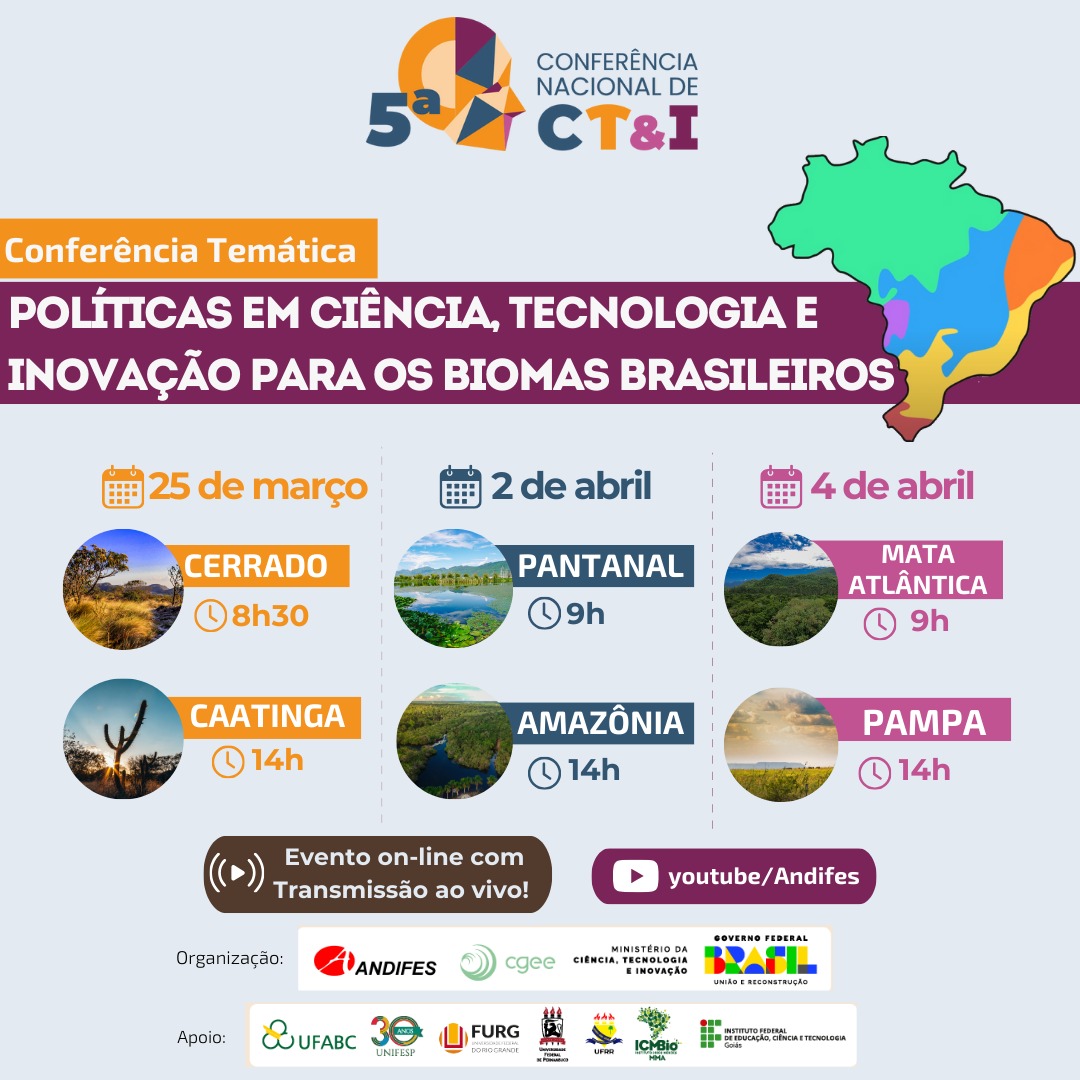 A Associação Nacional dos Dirigentes das Instituições Federais de Ensino Superior (Andifes) organizou um evento virtual voltado para as políticas de Ciência, Tecnologia e Inovação (CT&I) direcionadas aos biomas brasileiros. Marcado para os dias 25 de março, 2 e 4 de abril, o evento faz parte da 5ª Conferência Nacional de CT&I e será transmitido no Canal Oficial da Andifes. O debate sobre esse importante patrimônio natural do Brasil ocorrerá com interação em tempo real com a audiência.