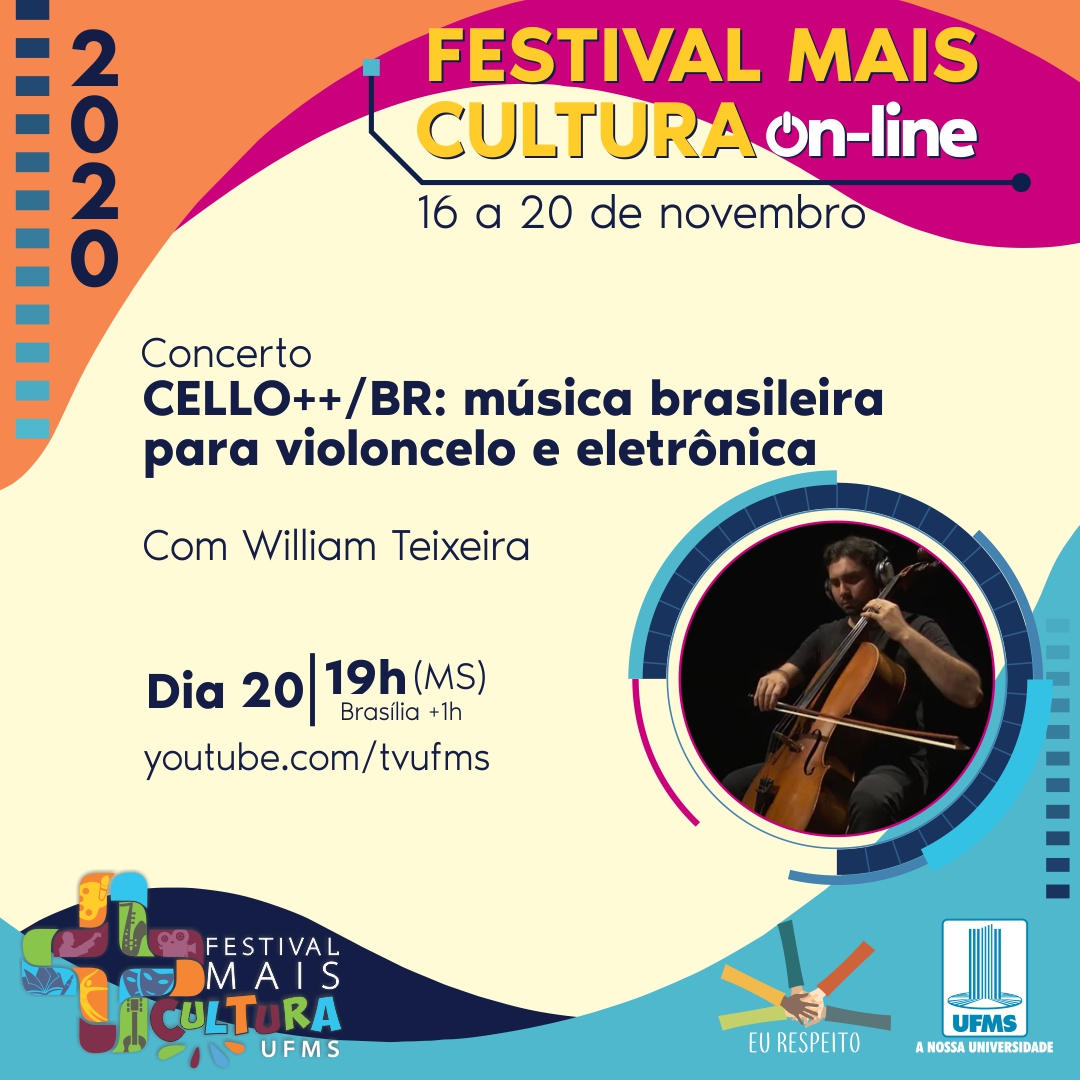 Para fechar a primeira semana do Festival Mais Cultura, o professor William Teixeira irá performar o recital CELLO++/BR: música brasileira para violoncelo e eletrônica, junto a outros quatro artistas. A transmissão será pelo canal da TV UFMS no YouTube, às 19h do dia 20.