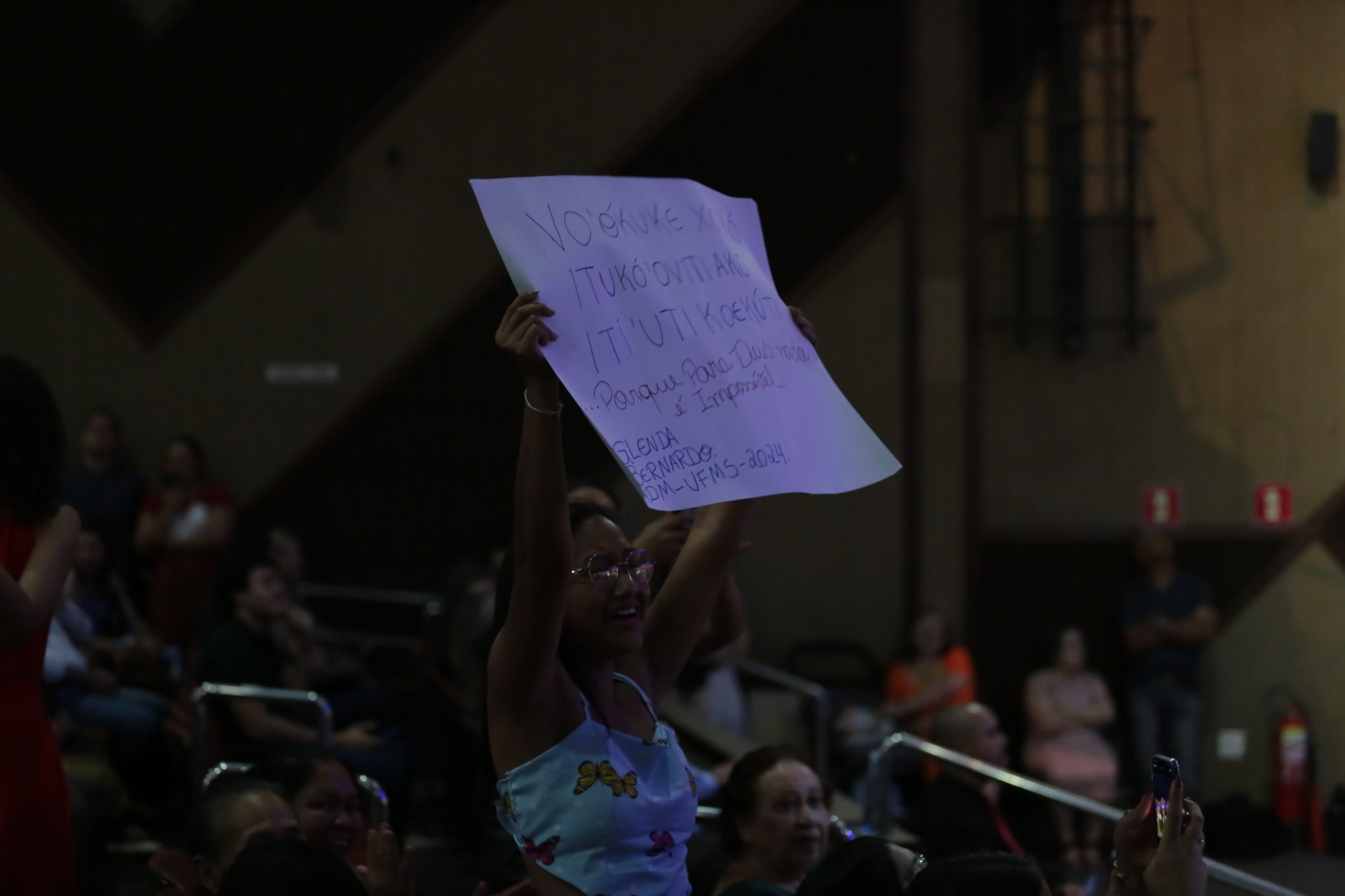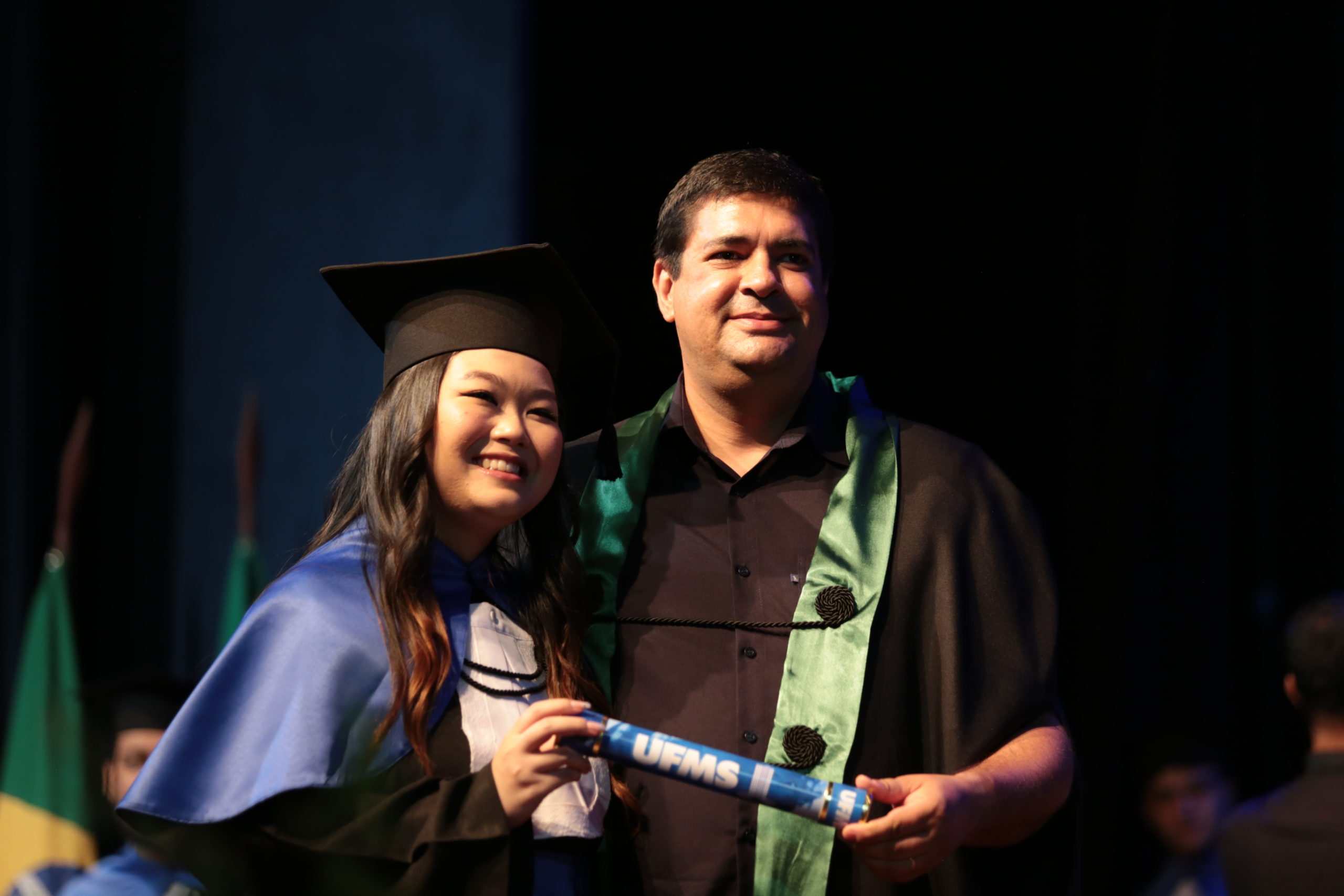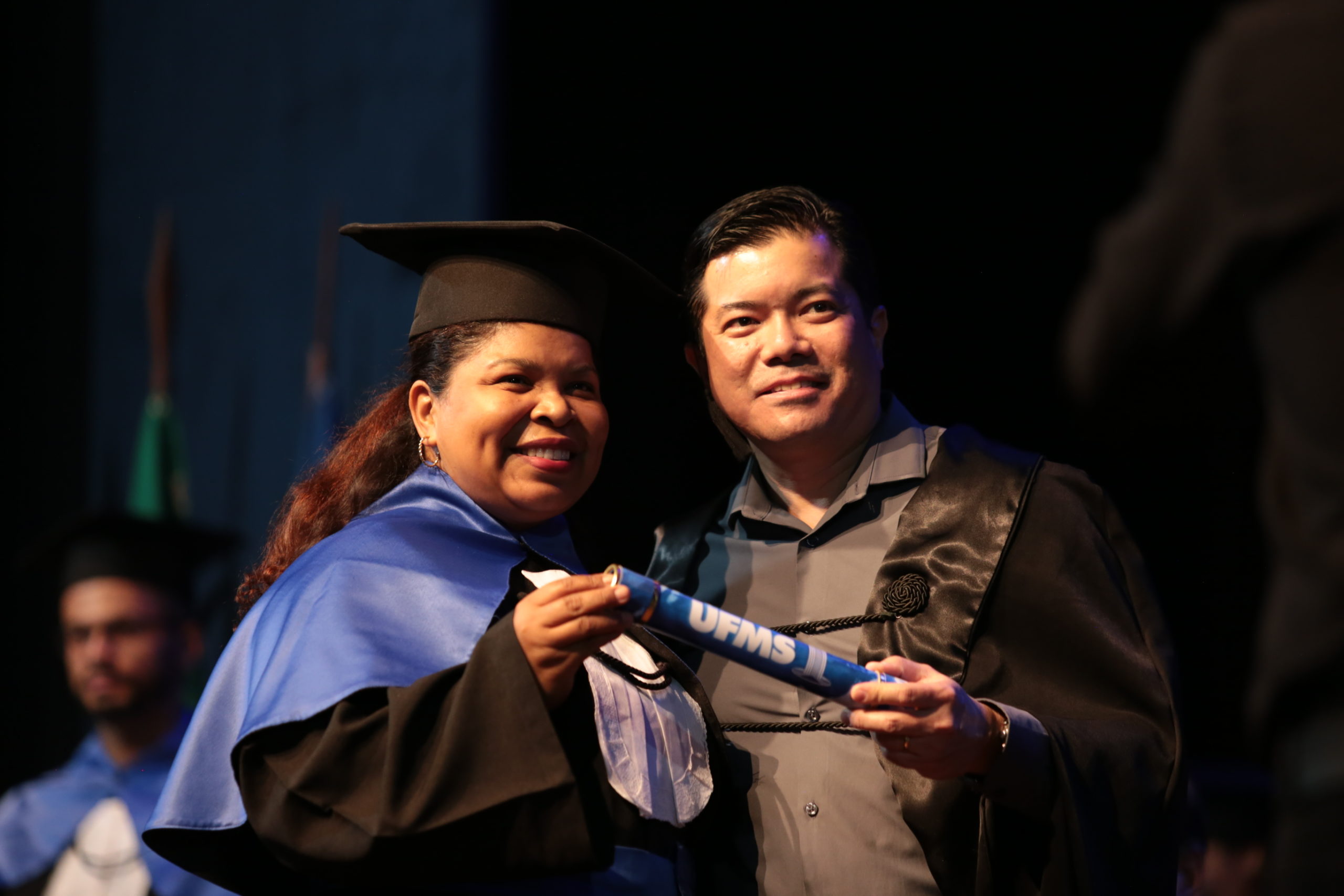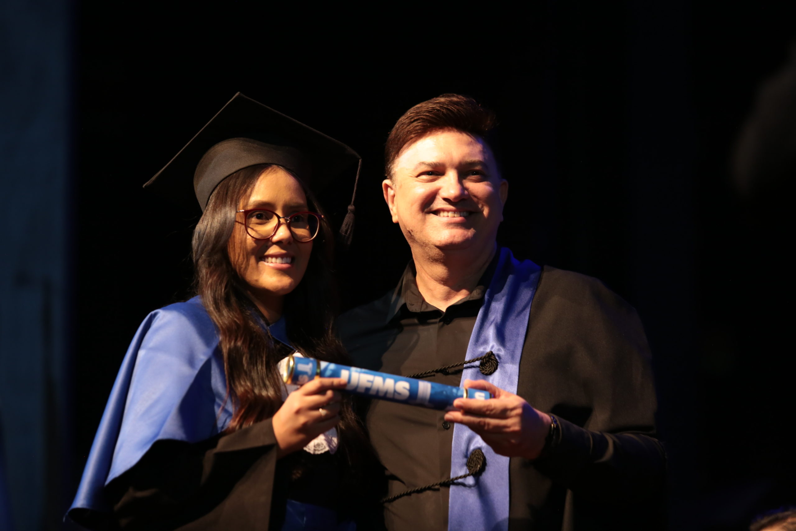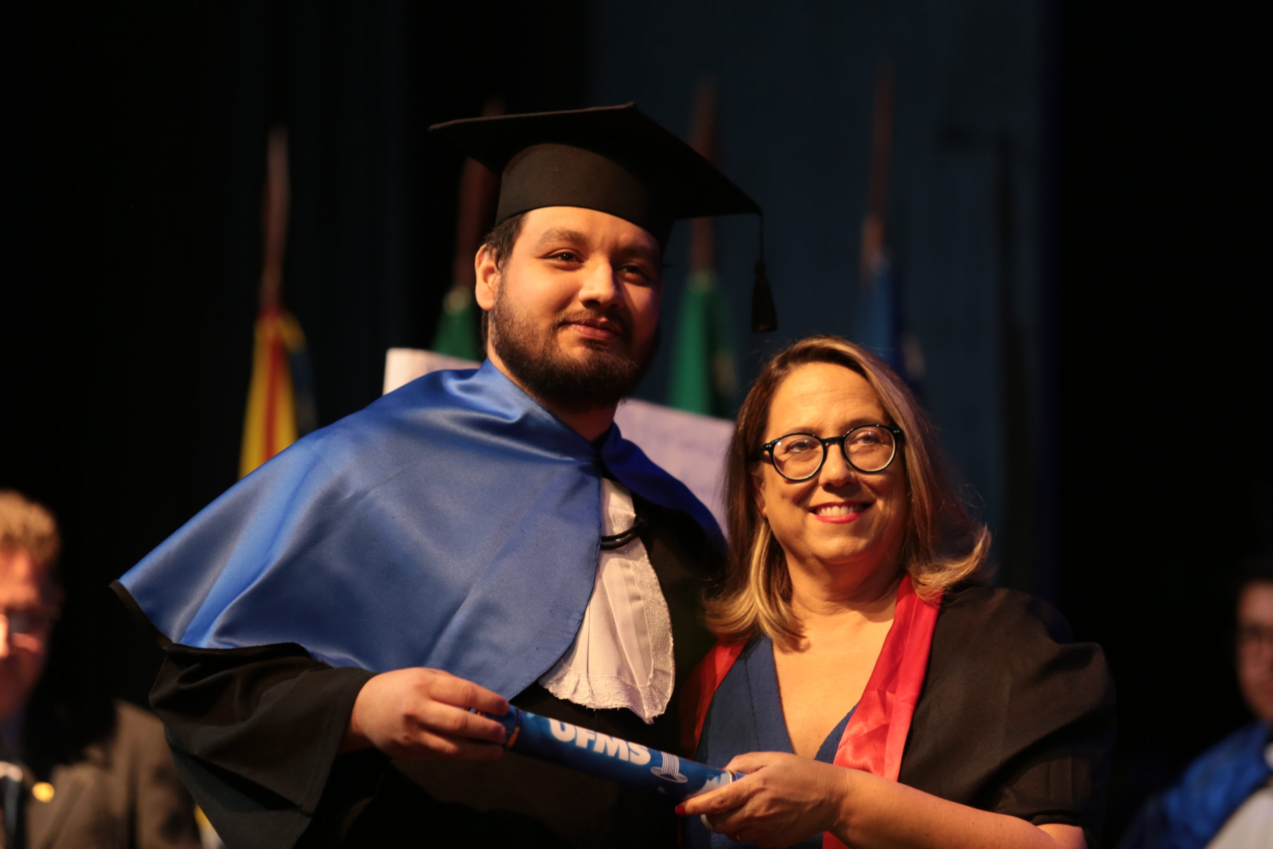 Entre os formandos que subiam a rampa do Teatro Glauce Rocha, Glenda Verão se destacava pelos adereços da etnia indígena Terena. Para a formanda em Administração, a Instituição representa um local de acolhida. “Quando eu entrei aqui, a Universidade me abraçou, me acolheu como uma mãe. Eu tive muitas dificuldades pelas diferenças culturais, mas também recebi muito apoio dos professores. Depois que eu entrei, abri portas também para o meu irmão e minha irmã, que hoje também estudam na UFMS”.