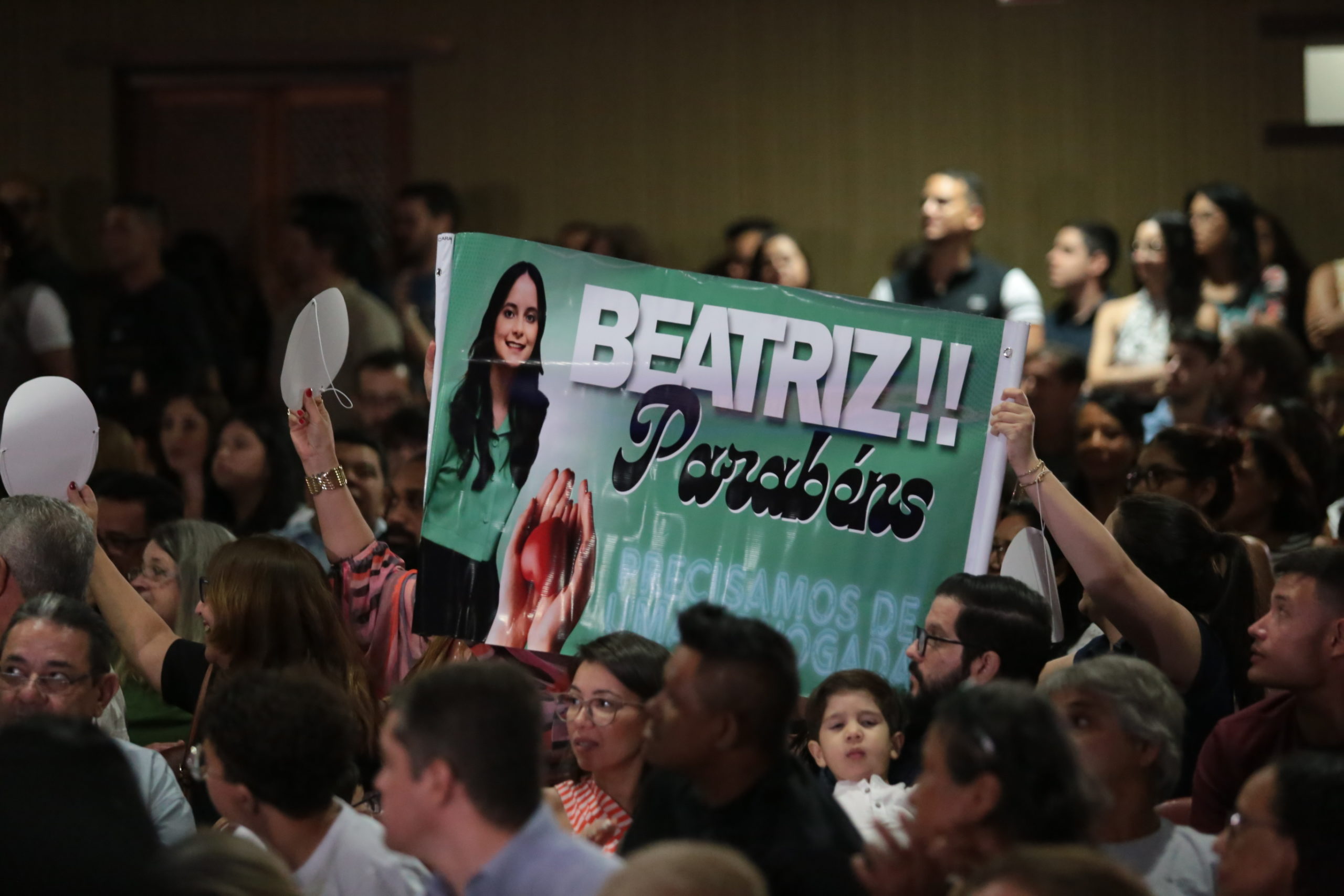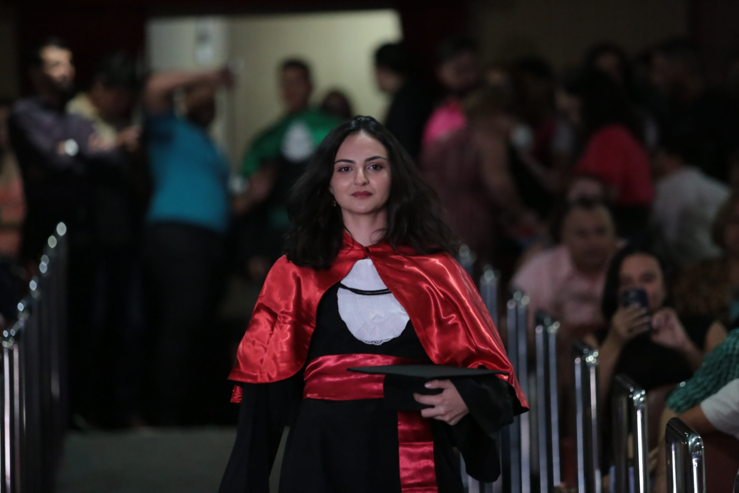 A formanda do curso de Direito Maria Eduarda Pereira chegou ao evento acompanhada por sua família, a quem dedica este momento. “Eu me sinto realizada por chegar aqui. E se hoje estou finalizando esse ciclo, é por causa da minha família que está comigo nesse momento, que me deu todo apoio do mundo”. Para o pai da formanda, Eduardo Pereira, que também é advogado, a palavra que define a noite é orgulho. “Quando ela resolveu que iria fazer Direito, que queria seguir esse caminho, eu fiquei muito satisfeito e maravilhado. Me sinto muito orgulhoso de vê-la chegar nesse momento. Vou até montar um escritório, porque agora já tenho uma sócia para poder trabalhar junto”, brincou.