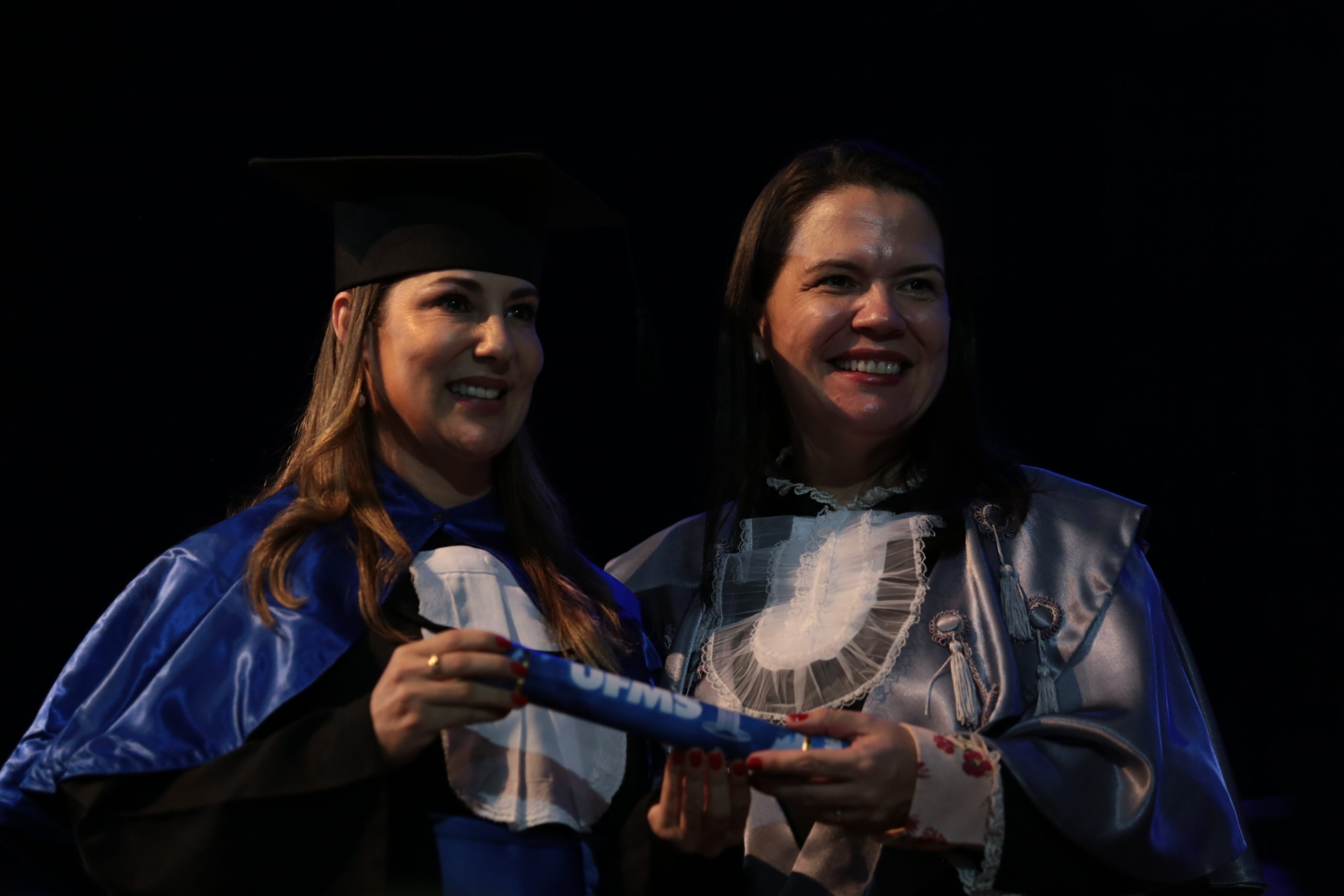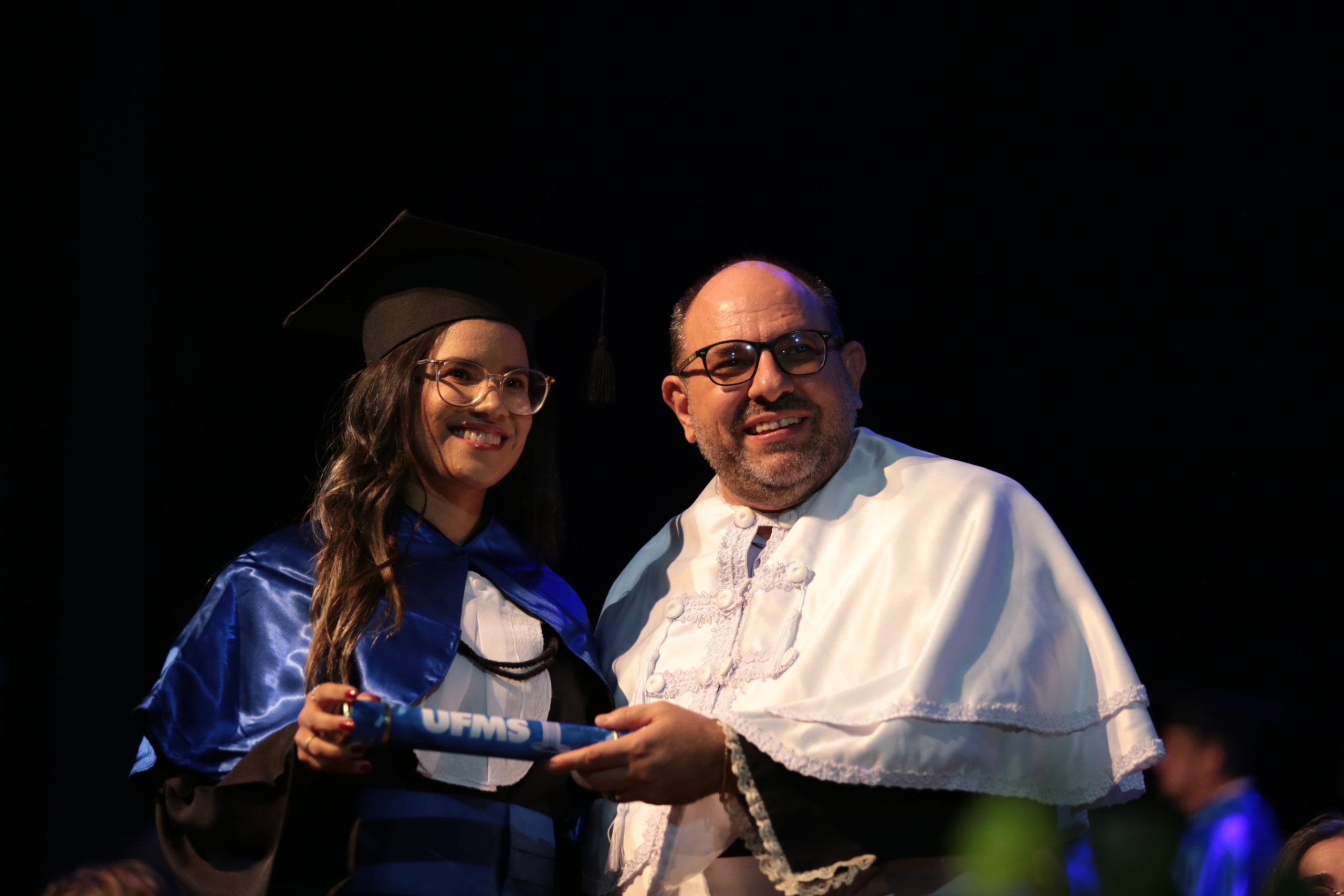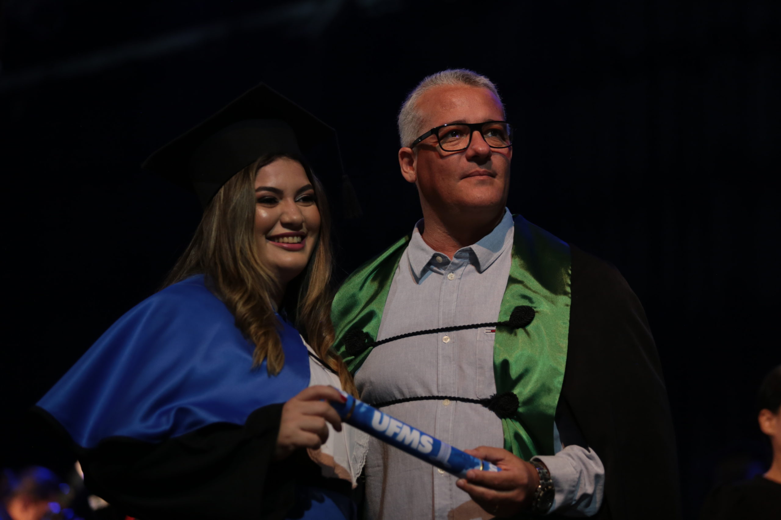 A professora da Faed e paraninfa das turmas de licenciatura e bacharelado em Educação Física, Mariana Biagi Batista, falou em nome dos docentes homenageados na solenidade. “Hoje celebramos um marco significativo na vida de cada um dos formandos presentes. A conquista de um diploma de ensino superior em uma instituição pública federal, como a nossa UFMS, é uma realização que merece ser comemorada com muito orgulho. Essa Instituição não é apenas um espaço de aprendizado, mas um verdadeiro pilar de formação e desenvolvimento, e vocês agora fazem parte dessa rica história”, comemorou.