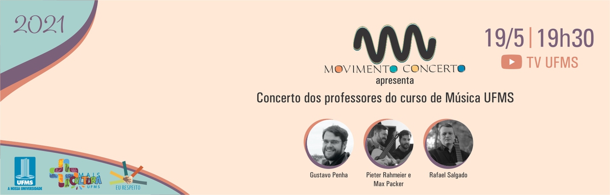 Nesta quarta-feira, 19, a partir das 19h30 será transmitida pelo canal da TV UFMS a edição de maio do programa Movimento Concerto. A apresentação será dos docentes do curso de Música Gustavo Penha, Pieter Rahmeier, Max Packer e Rafael Salgado. A ação faz parte da campanha Eu Respeito, que neste mês celebra o trabalho desempenhado por todos os professores e técnicos-administrativos que constituem a Universidade.
