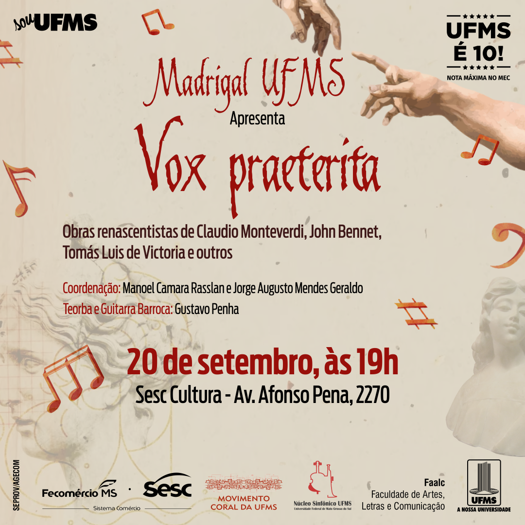 A apresentação musical Vox praeterita abre a temporada de atividades do segundo semestre do projeto Madrigal UFMS, com obras renascentistas de Claudio Monteverdi, John Bennet e Tomás Luis de Victoria. A primeira apresentação será nesta quarta-feira, 20, no Sesc Cultura, localizado na Avenida Afonso Pena, nº 2.270, Centro. A entrada é gratuita e aberta ao público. Os ingressos devem ser reservados na página.
