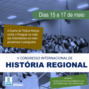 quinta edição do Congresso Internacional de História Regional será realizada no câmpus de Aquidauana (CPAQ) de 15 a 17 de maio. O tema será “A Guerra da Tríplice Aliança contra o Paraguai na visão dos historiadores sul mato-grossenses e paraguaios”.