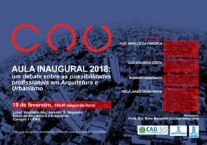 A partir das 16h30 de hoje (19) será realizada no anfiteatro Arq. Jurandir Nogueira do bloco de Arquitetura e Urbanismo a aula inaugural 2018 da graduação. O evento será “Um debate sobre as possibilidades profissionais na arquitetura e urbanismo”.
