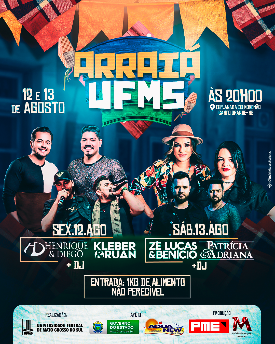 Na sexta-feira, 12 de agosto, o arraiá será nos Câmpus de Naviraí, com Batô e Ferrê, a partir das 18h30, e de Nova Andradina, a partir das 18h, com a Banda Rolê Classe A.