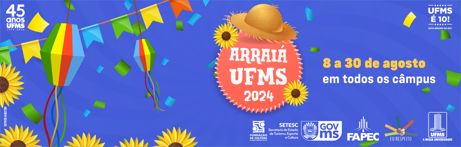 O Arraiá UFMS 2024 será realizado em todos os câmpus entre os dias 8 e 30 de agosto. A festa tradicional faz parte da campanha Eu Respeito e será aberta a toda a comunidade, com atrações musicais, danças e barracas com comidas típicas. A entrada do evento será 1 kg de alimento não perecível destinado às instituições filantrópicas cadastradas junto à Universidade.