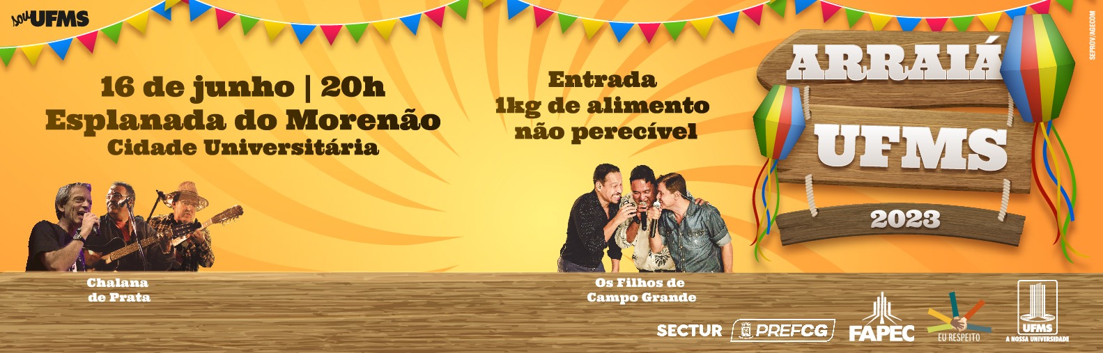 O tradicional Arraiá UFMS já tem data marcada e será realizado nesta sexta-feira, 16, a partir das 20 horas, na Esplanada do Morenão, na Cidade Universitária. A noite será de muita música com as bandas Chalana de Prata e Os Filhos de Campo Grande, além de quadrilha e comidas típicas. A entrada é com 1 kg de alimento não perecível. A festa faz parte da programação da campanha Eu Respeito de junho.