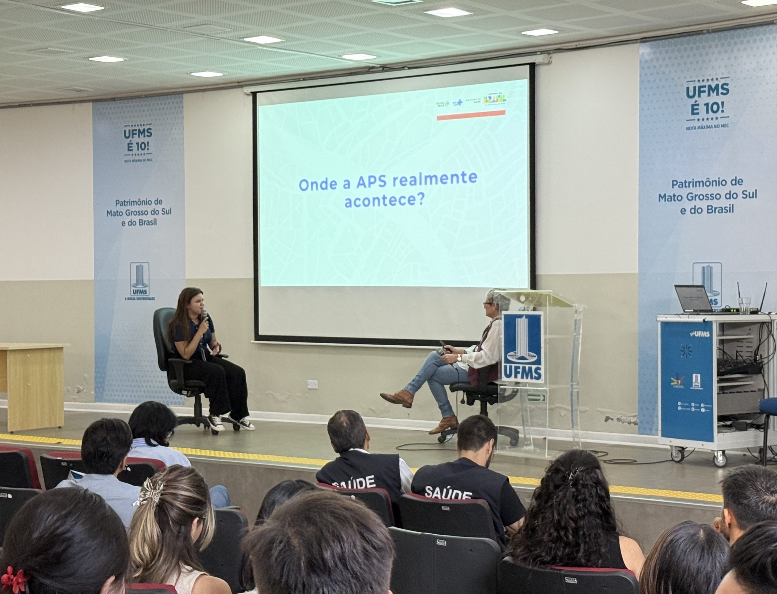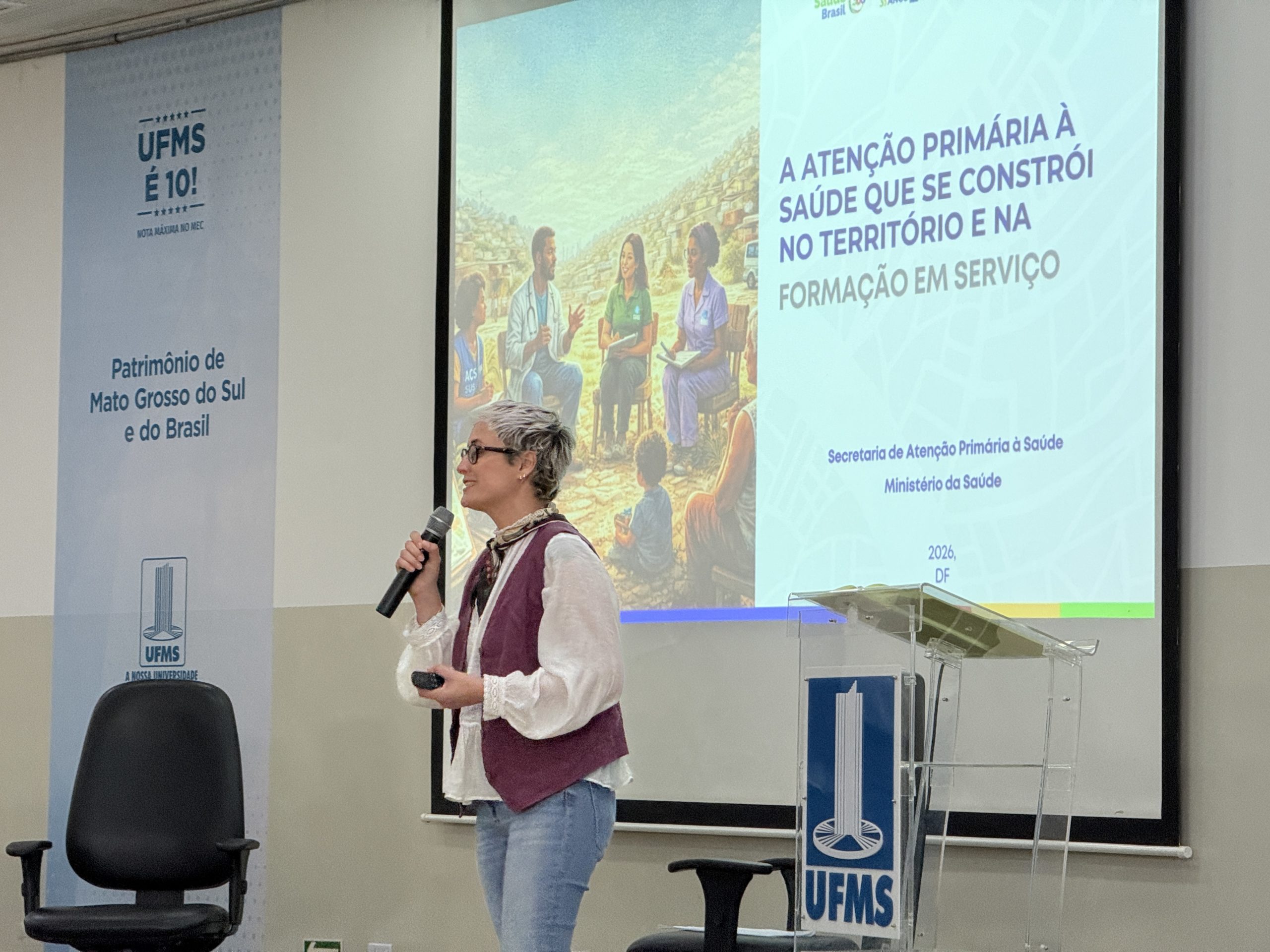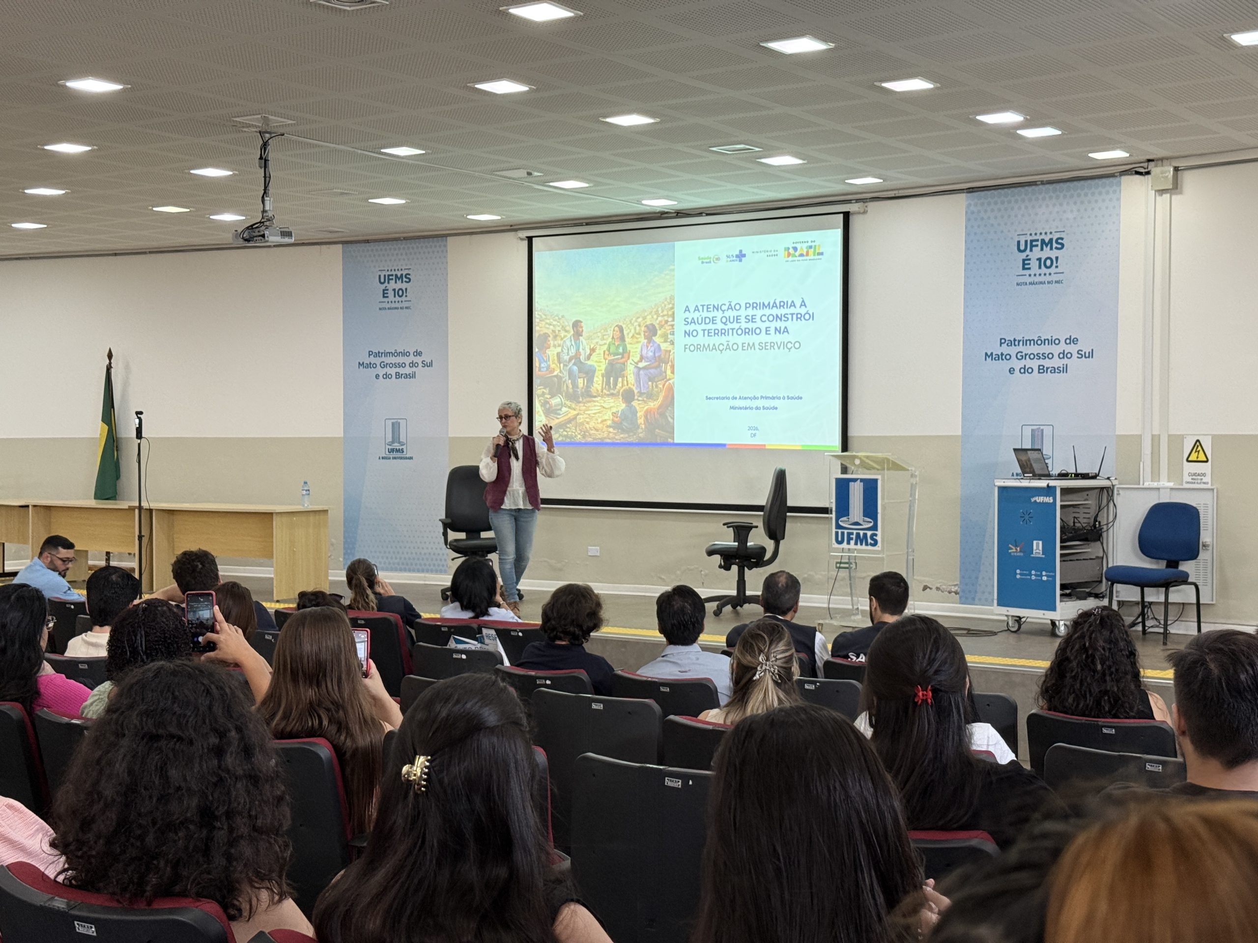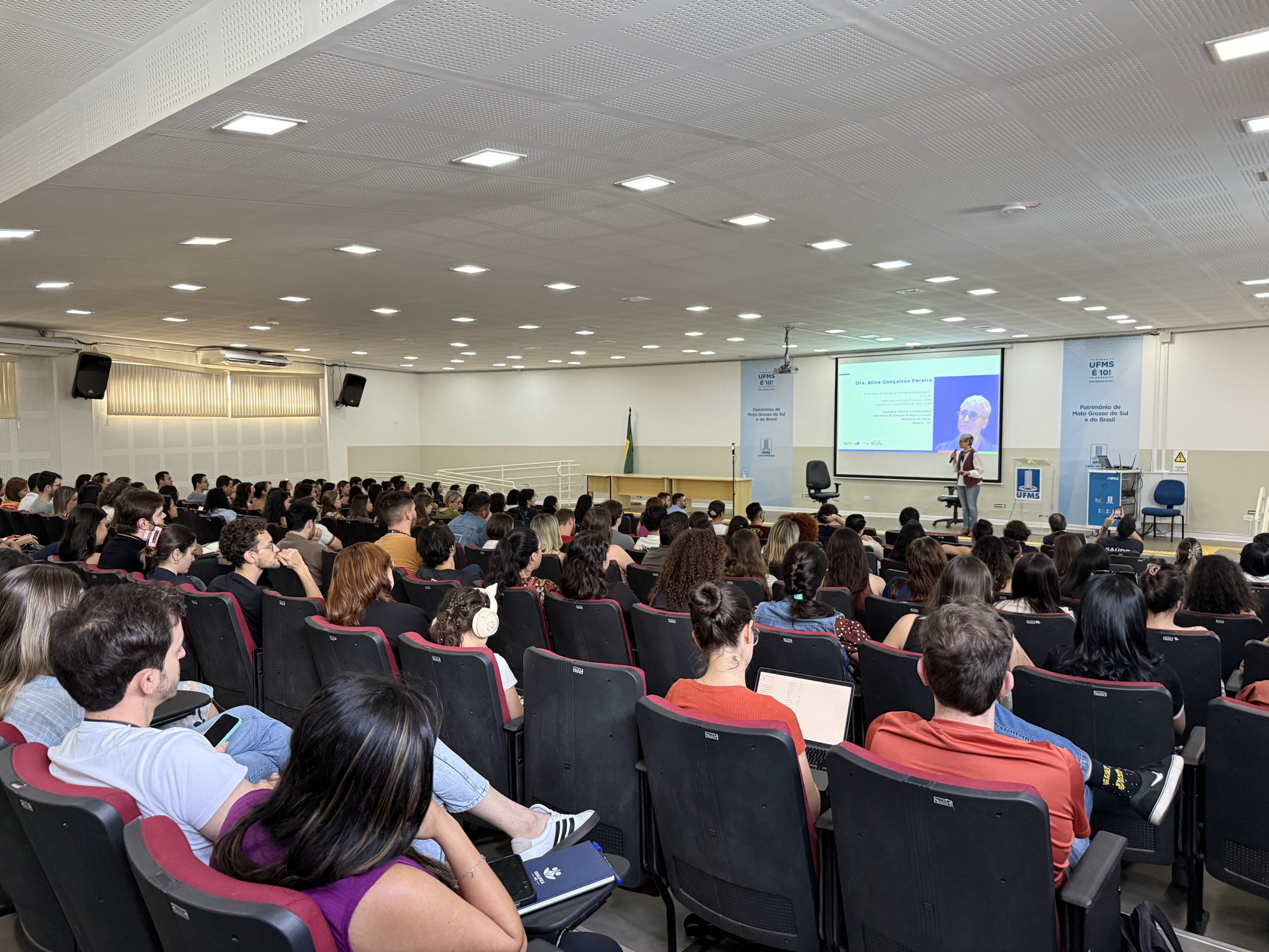 A UFMS de Campo Grande recebeu a assessora técnica e institucional da Secretaria de Atenção Primária à Saúde do Ministério da Saúde, Aline Gonçalves, para a aula magna de abertura dos trabalhos do Programa de Pós-Graduação em Saúde da Família (PPGSF), do Instituto Integrado de Saúde (Inisa) da UFMS, em parceria com a Residência Multiprofissional e Médica da Secretaria Municipal de Saúde de Campo Grande (Sesau) com a Fundação Oswaldo Cruz.