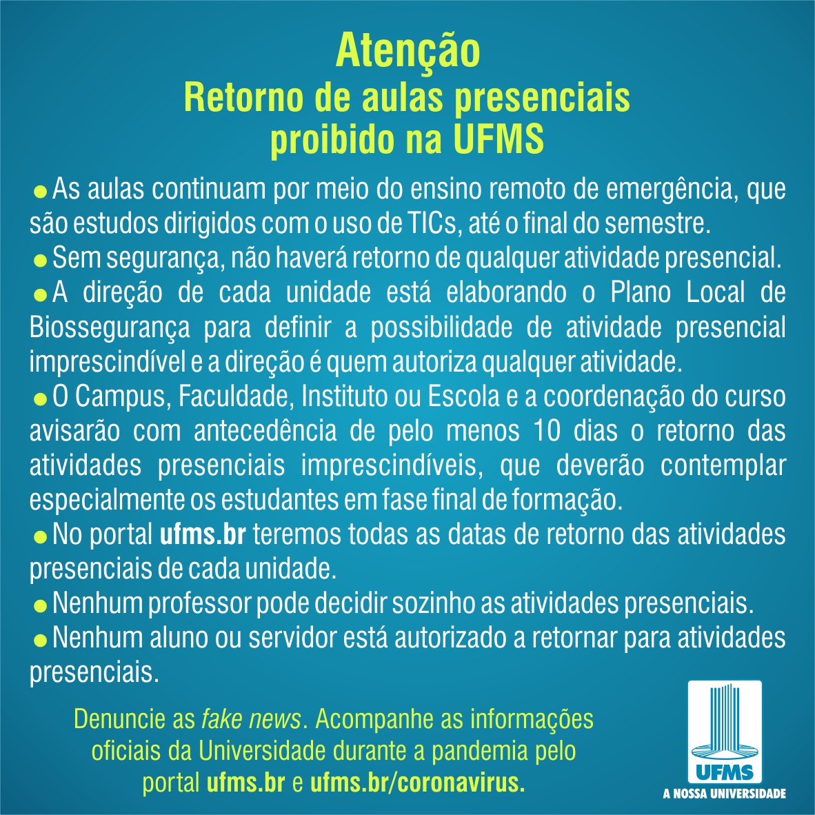 UFMS » Coronavírus » Atenção: retorno de aulas presenciais proibido na UFMS