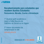 Os estudantes da UFMS que recebem auxílios Permanência, Moradia, Creche e Alimentação, têm até dia 31 de janeiro para fazer