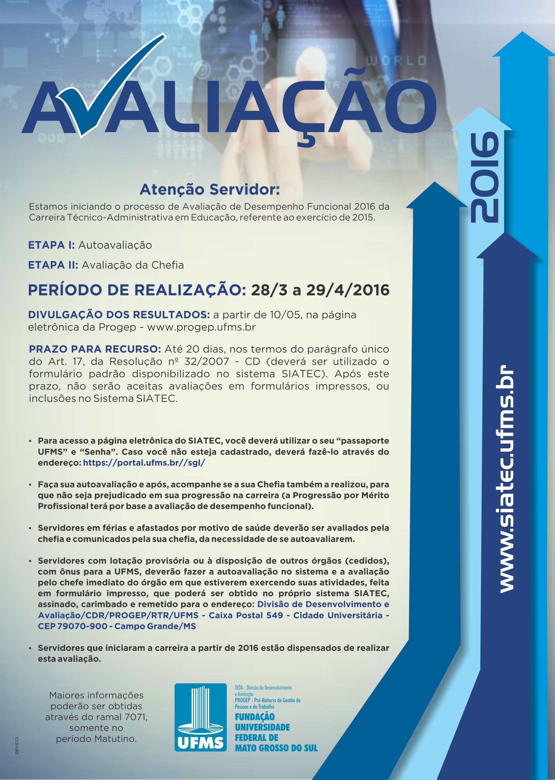 ão de Desenvolvimento e Avaliação/CDR/Progep informa que o processo de avaliação de desempenho funcional dos servidores Técnicos Administrativos ativos e afastados ocorrerá no período de 28/03 À 29/04/2016. As avaliações serão realizadas diretamente pelo endereço eletrônico: www.siatec.ufms.br.