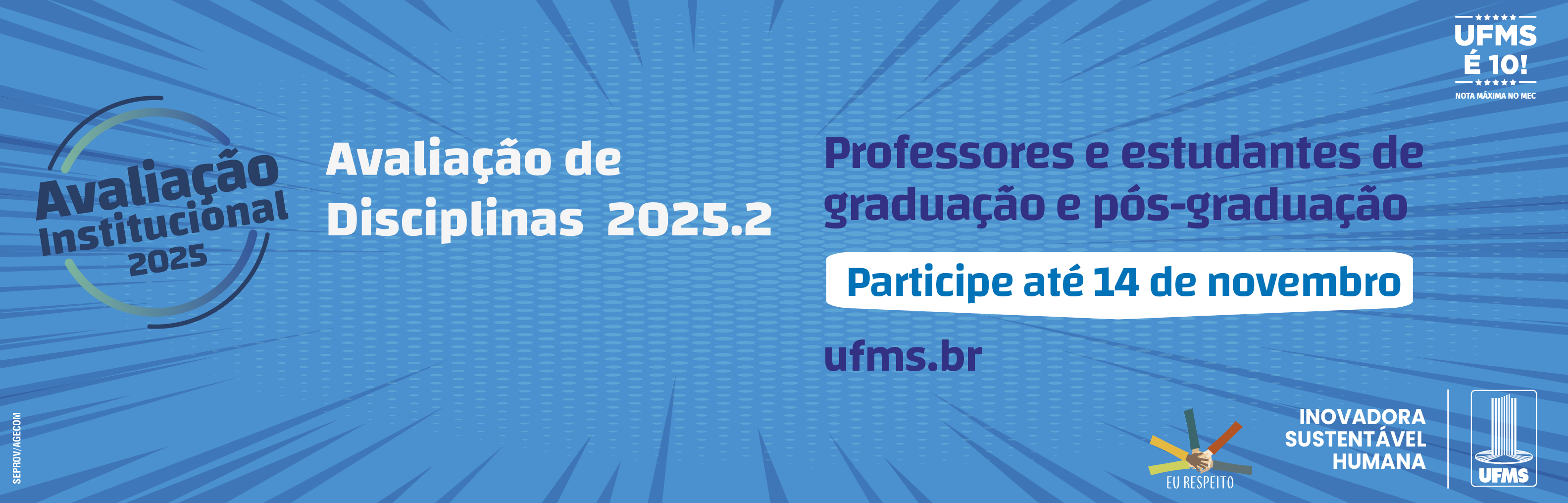 Até 14 de novembro, professores e estudantes de cursos de graduação presenciais e a distância, mestrado, doutorado, especializações, MBA e residências podem realizar a Avaliação de Disciplinas do segundo semestre de 2025. A participação deve ser enviada de forma ética e respeitosa, por meio do Sistema da Avaliação Institucional, com acesso pelo Passaporte UFMS.