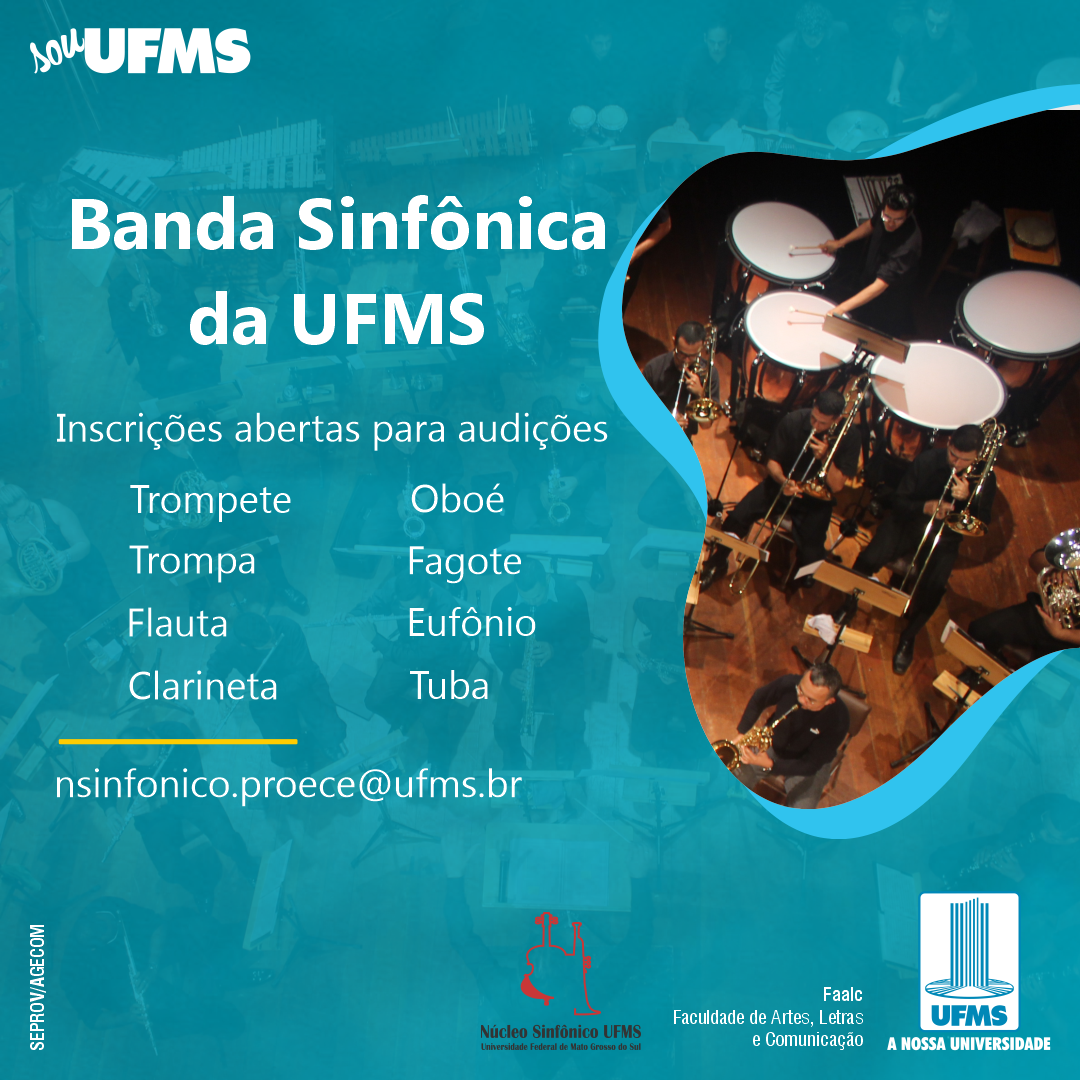 Músicos que queiram participar da Banda Sinfônica da UFMS já podem fazer a inscrição, manifestando interesse por meio do e-mail nsinfonico.proece@ufms.br . Serão selecionados músicos com habilidade na execução dos seguintes instrumentos de sopro: trompete, trompa, flauta, clarineta, oboé, fagote, eufônio e tuba.
