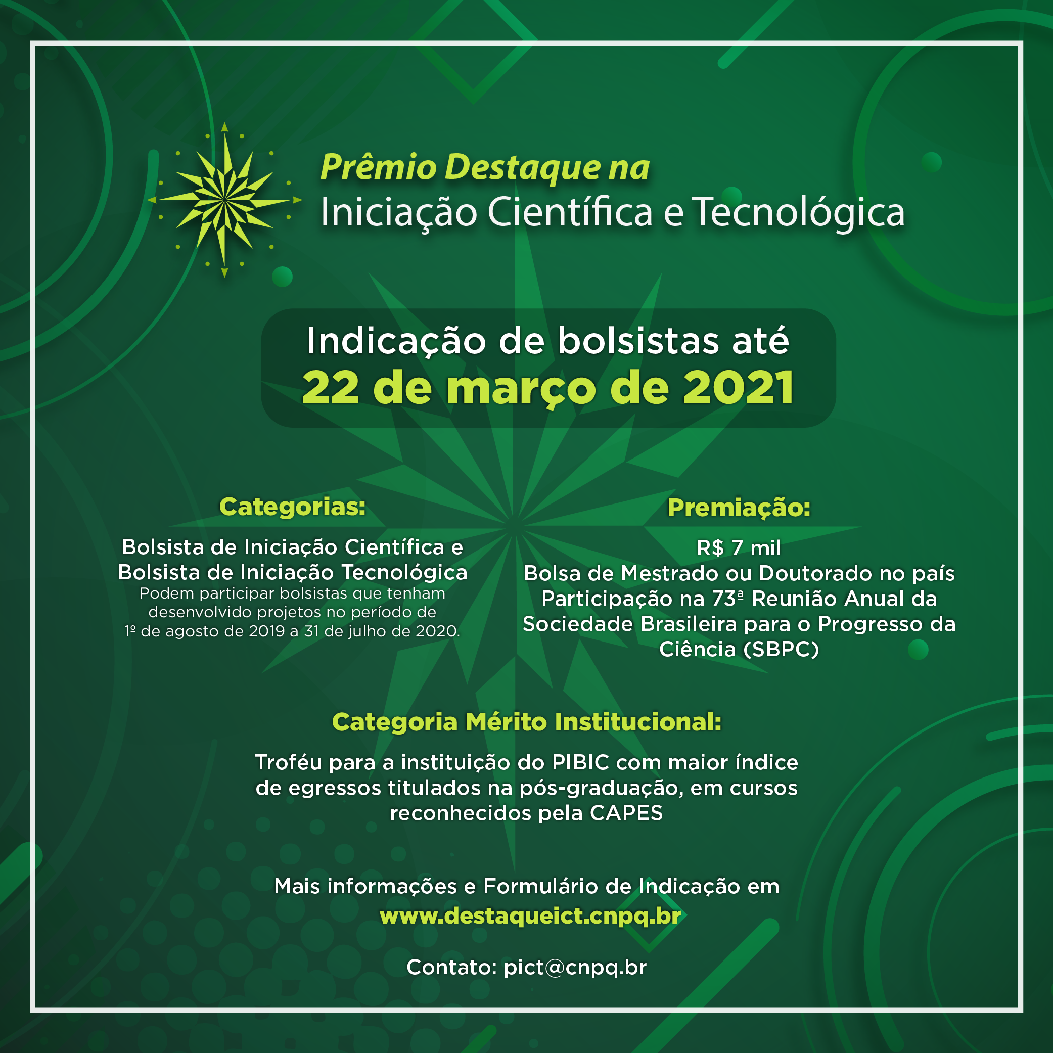 Estão abertas as inscrições para o 18º Prêmio Destaque na Iniciação Científica e Tecnológica, realizado pelo Conselho Nacional de Desenvolvimento Científico e Tecnológico (CNPq) com o objetivo de estimular bolsistas de Iniciação Científica e Iniciação Tecnológica a desenvolver relatórios finais que se destacam pela relevância e qualidade.