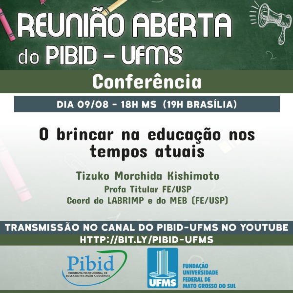 Nesta segunda-feira, 9, às 18h (horário de MS), será realizada conferência sobre O brincar na educação nos tempos atuais. O evento integra a programação de agosto da Reunião Aberta do Programa Institucional de Bolsa de Iniciação à Docência (Pibid) – UFMS.