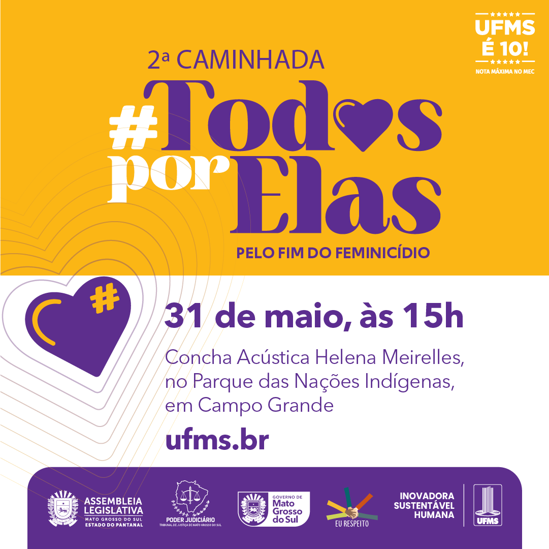 No dia 31 de maio, a partir das 15h, no Parque das Nações Indígenas, será realizada a 2ª Caminhada #TodosPorElas pelo fim do feminicídio. A UFMS apoia a campanha promovida pelo Tribunal de Justiça de Mato Grosso do Sul, por meio da Coordenadoria Estadual da Mulher em Situação de Violência Doméstica e Familiar, em parceria com o Governo do Estado e a Assembleia Legislativa. As primeiras 400 inscrições receberão brindes. Para participar, basta preencher o formulário disponível neste link.