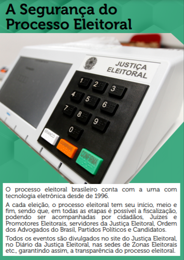 Os materiais explicam a segurança da urna eletrônica, os principais sistemas utilizados no processo eleitoral, o que configura um voto válido, o que significa se abster de votar e as diferenças entre voto nominal, voto na legenda, voto em branco e voto nulo.