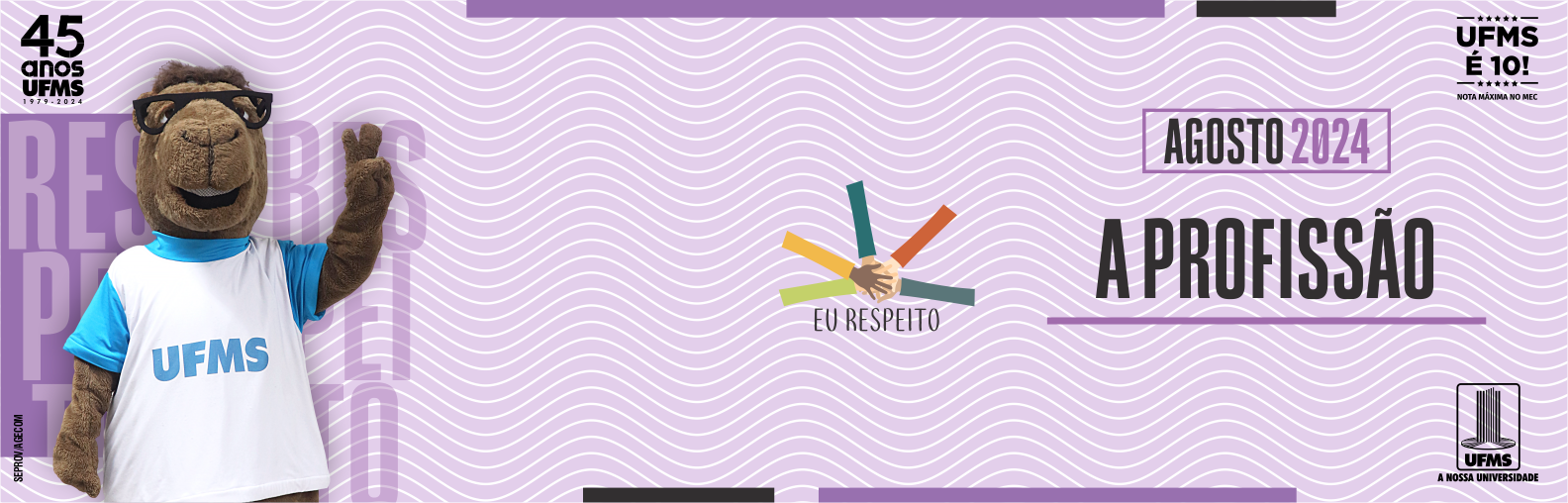 A formação de profissionais qualificados que, por sua vez, transformam e engrandecem a sociedade, é uma das missões da UFMS. Para homenagear os profissionais que compõem a Universidade, assim como para reforçar seu compromisso com a formação de recursos humanos, a campanha Eu Respeito de agosto tem como tema A Profissão.