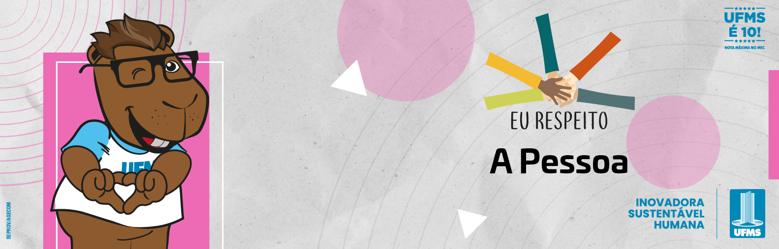 Nossa Universidade é formada por uma comunidade de quase 50 mil pessoas entre estudantes, professores, técnicos-administrativos e colaboradores, que juntos contribuem diariamente para a maior e melhor Instituição de ensino pública, gratuita, inclusiva e de qualidade de Mato Grosso do Sul. Com isso, a campanha Eu Respeito de outubro tem como tema a Pessoa. Em alusão ao mês de conscientização sobre a prevenção ao câncer de mama e de colo de útero, o Monumento Símbolo ficará iluminado na cor rosa.