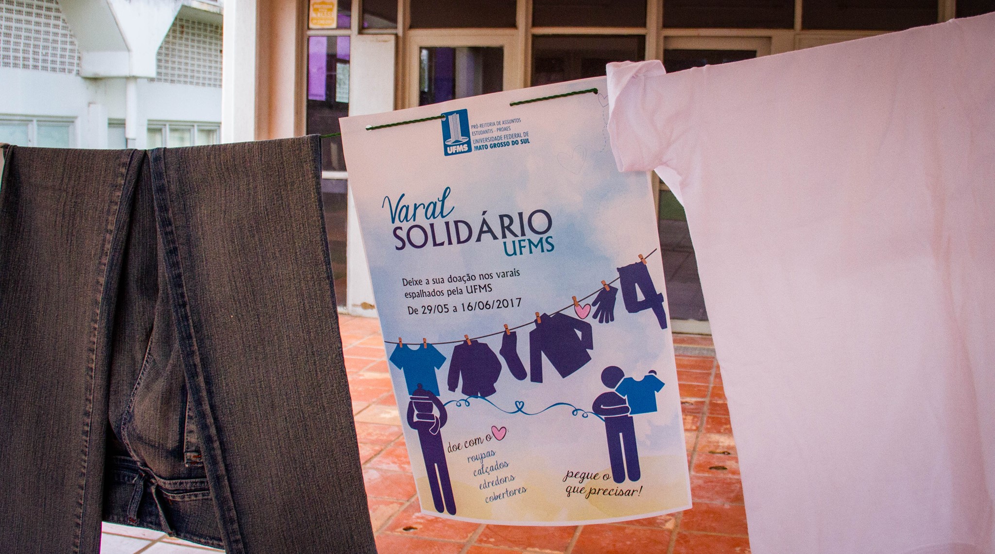 Quem andou pela Universidade Federal de Mato Grosso do Sul (UFMS) nesta manhã, pôde notar diversos varais espalhados . A ação faz parte da Campanha “Varal Solidário UFMS”, lançada hoje pela Pró-Reitoria de Assuntos Estudantis (Proaes).  O objetivo do projeto é arrecadar roupas para doação.